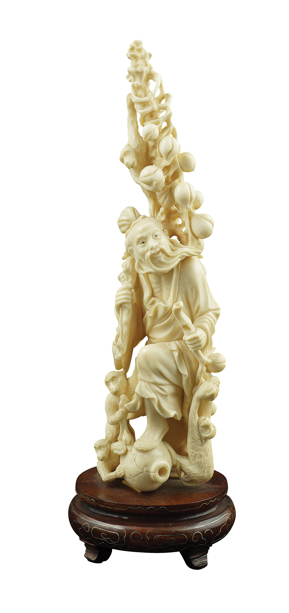 Scultura in avorio manifattura orientale del XIX Sec. peso lordo 503 gr. scolpita a raffigurare un vecchio con scimmiette poggiante su base in legno, h. 29,5 cm