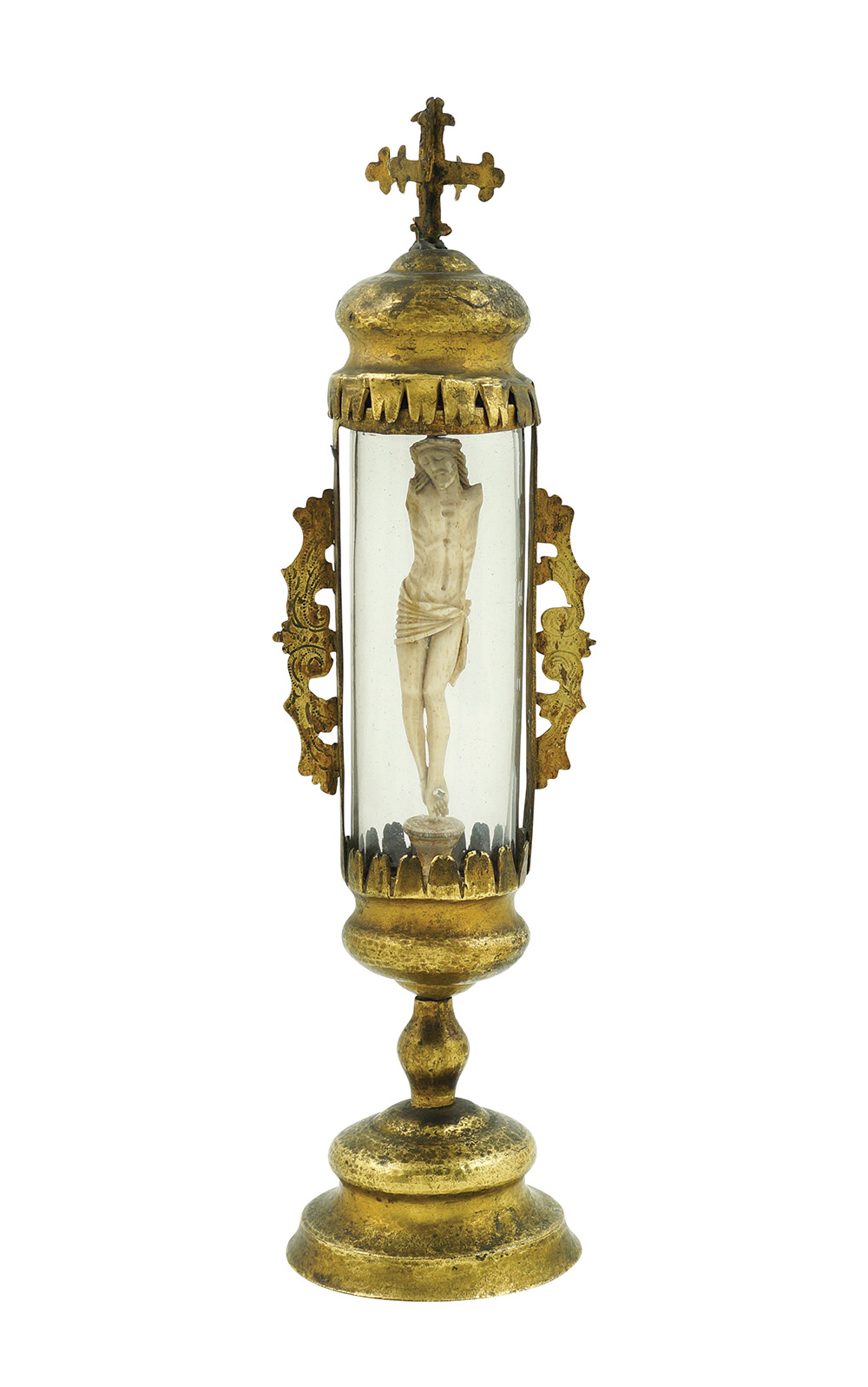 Figura di Cristo in avorio Sicilia, fine del XVIII Sec. h. 33 cm. entro una teca cilindrica in bronzo dorato e vetro, difetti