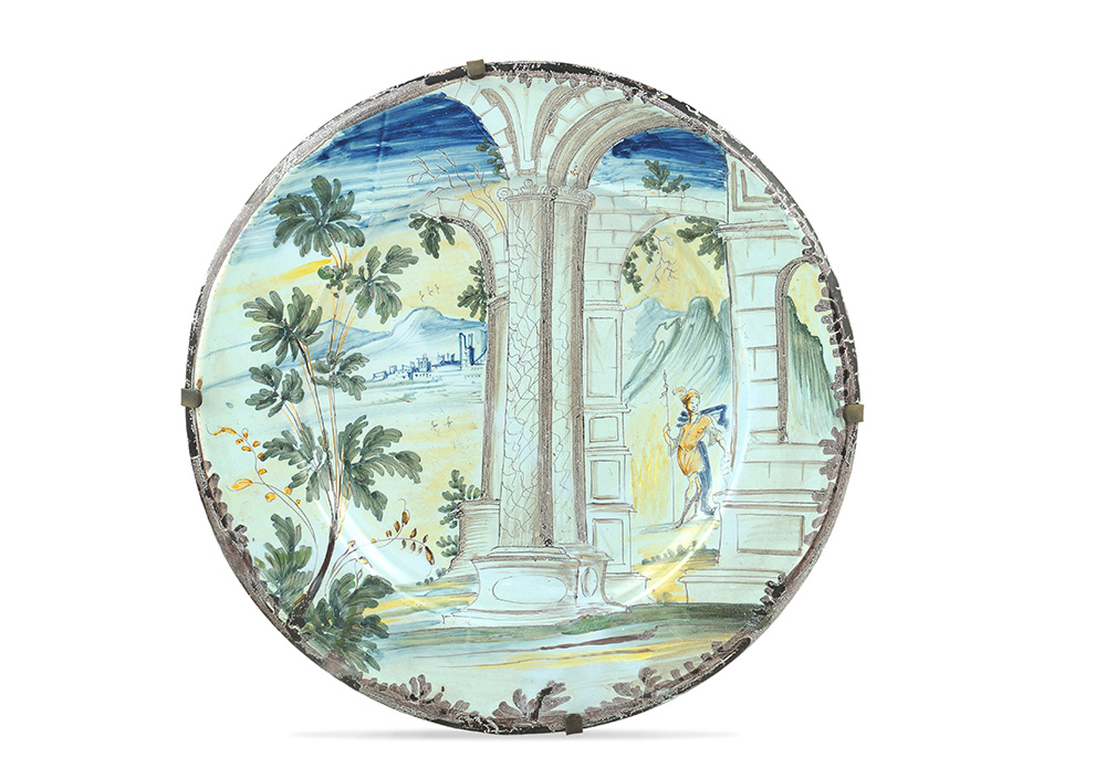 Grande piatto in maiolica Pavia, fine XVII - inizio XVIII Sec. d. 38 cm. decorato a gran fuoco a pieno campo con paesaggio, architettura ed una figura, restauri