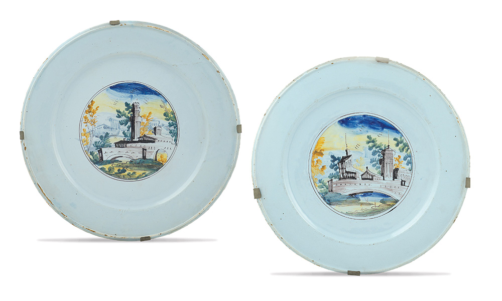 Coppia di grandi piatti da parata in maiolica