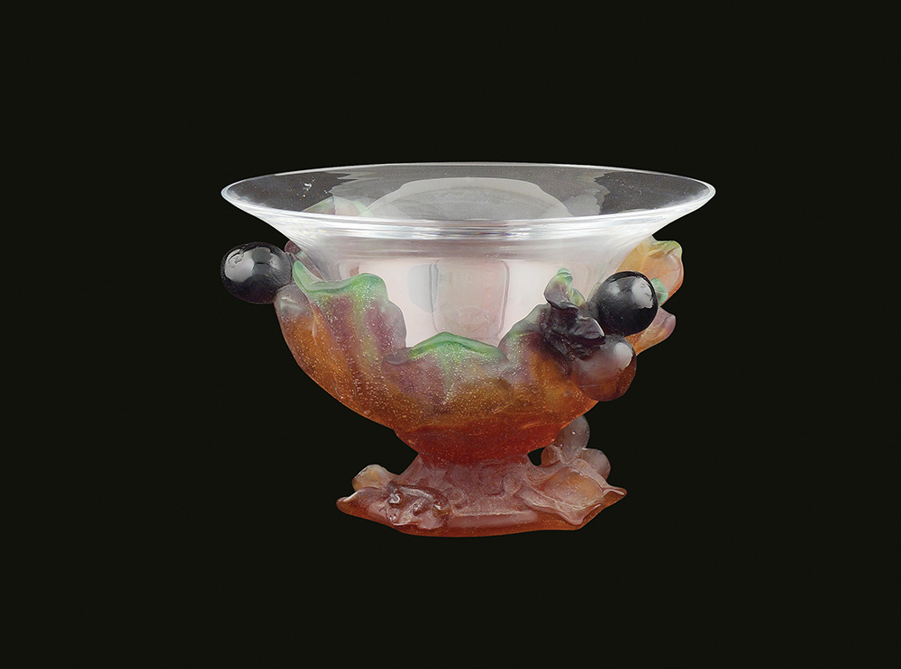 Bowl Daum Nancy Francia, XX Sec. 22x15,5 cm. struttura in vetro policromo decorato a raffigurare foglie di fico con salamandra, all'interno coppa circolare in vetro trasparente, firmata Daum France sotto la base