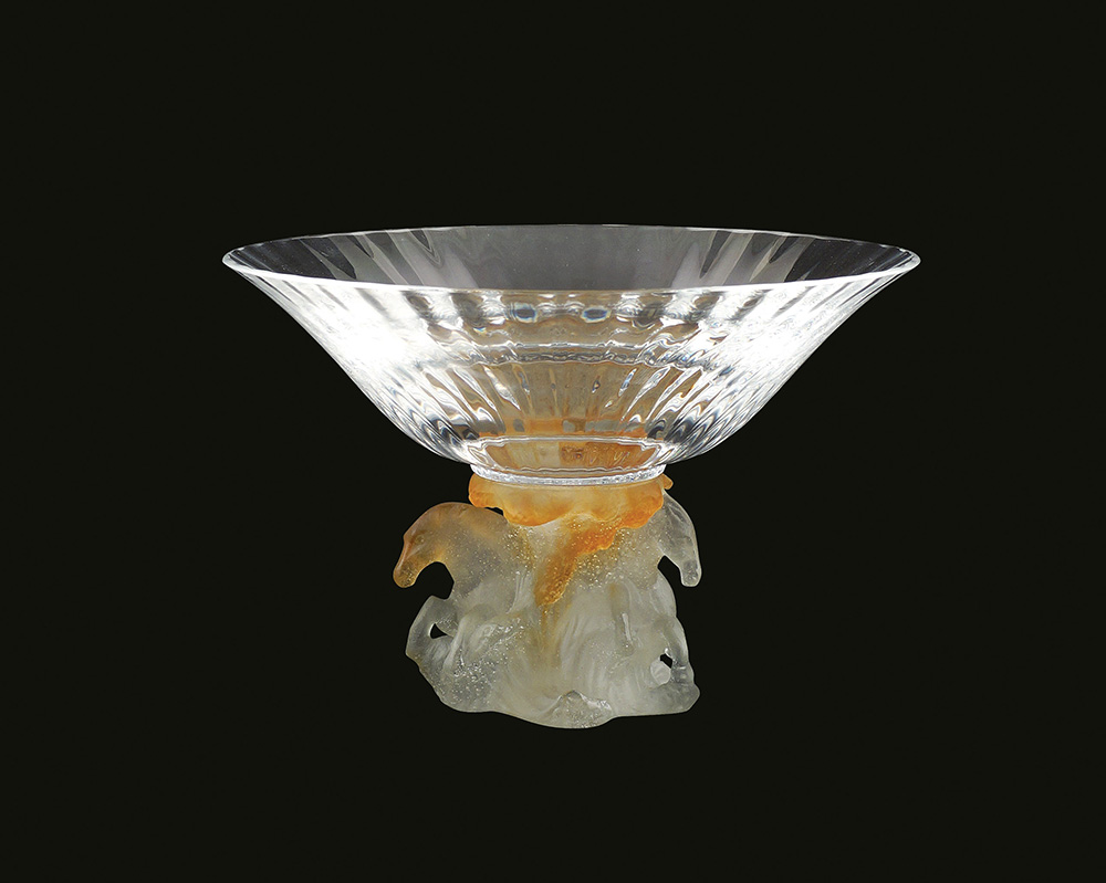 Coppa circolare Daum Nancy Francia, XX Sec. 10x15 cm. in vetro trasparente, satinato e colorato raffigurante cavalli, firmata Daum France sotto la base