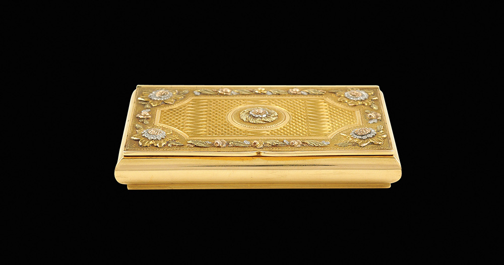 Tabacchiera in oro bicolore Francia, Parigi 1838 - 1846 1,8x7,9x5,1 cm. forma rettangolare con superficie incisa e decorata a motivi floreali, vegetali e volute, peso 84 gr.