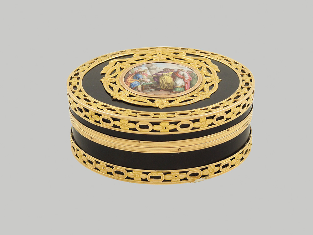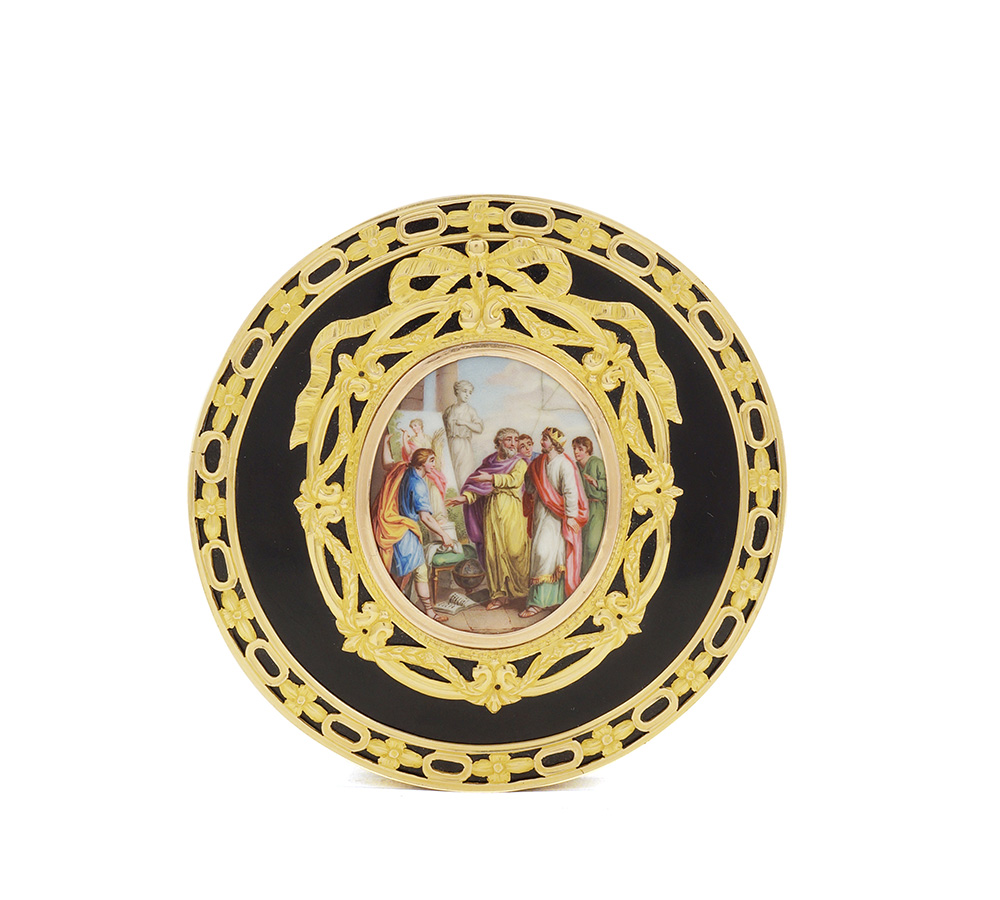 finemente cesellata e traforata a motivi floreali e di nodi d'amore, centrata da una miniatura in smalti policromi raffigurante "La visita di Alessandro il Grande nello studio di Apelle", orafo J. Alaterre attivo in Francia tra il 1768 ed il 1775, bolli territoriali, di garanzia e dell'orafo impressi sul bordo inferiore, 7,5x3 cm.