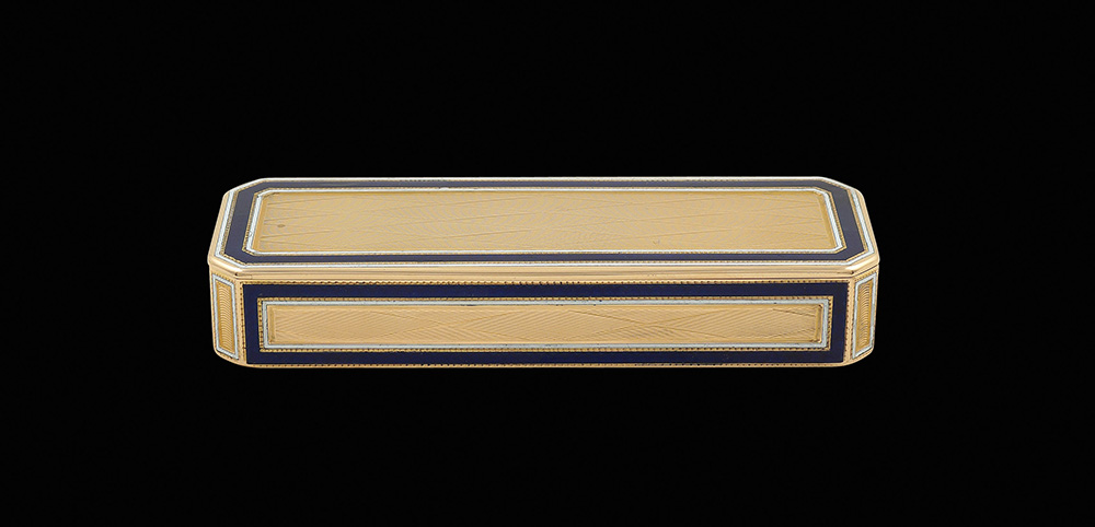 Tabacchiera in oro e smalto, Luigi XVI Hanau, 1790 circa 1,5x9x3 cm. forma rettangolare, decoro a losanghe con profili in smalto blu e bianco, peso 78 gr.