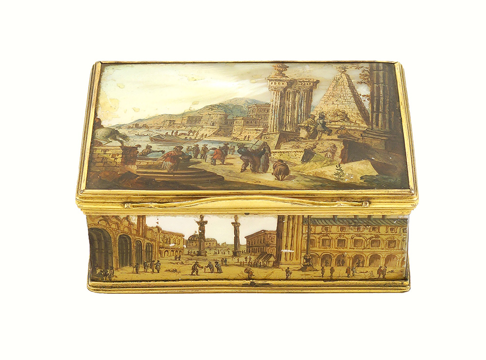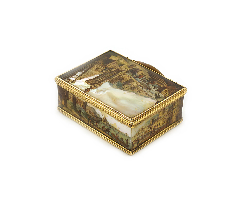 Tabacchiera in oro e madreperla Italia, XIX Sec. 3,2x8x6,3 cm. finemente dipinta in policromia a raffigurare "Capricci architettonici con personaggi", peso lordo 82 gr. Questa rara tabacchiera è costituita da montatura in oro con coperchio, base e parti laterali in madreperla a ricordare i capricci architettonici tipici in Italia nel XVIII secolo. Le vedute, spesso di fantasia, venivano affiancate da figure tratte da storie sacre e profane