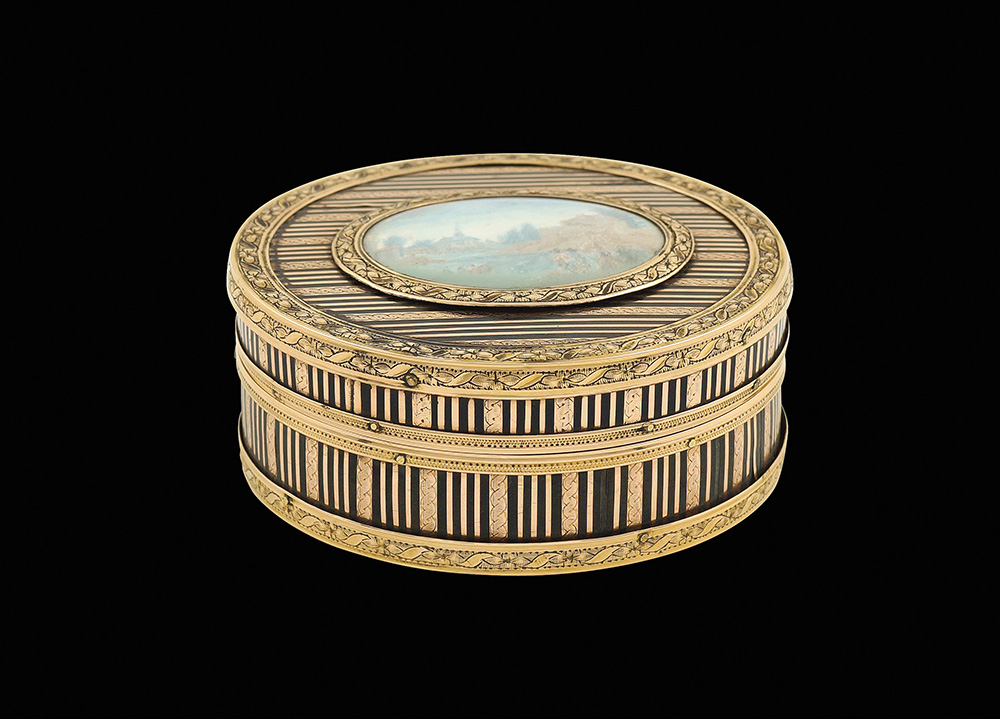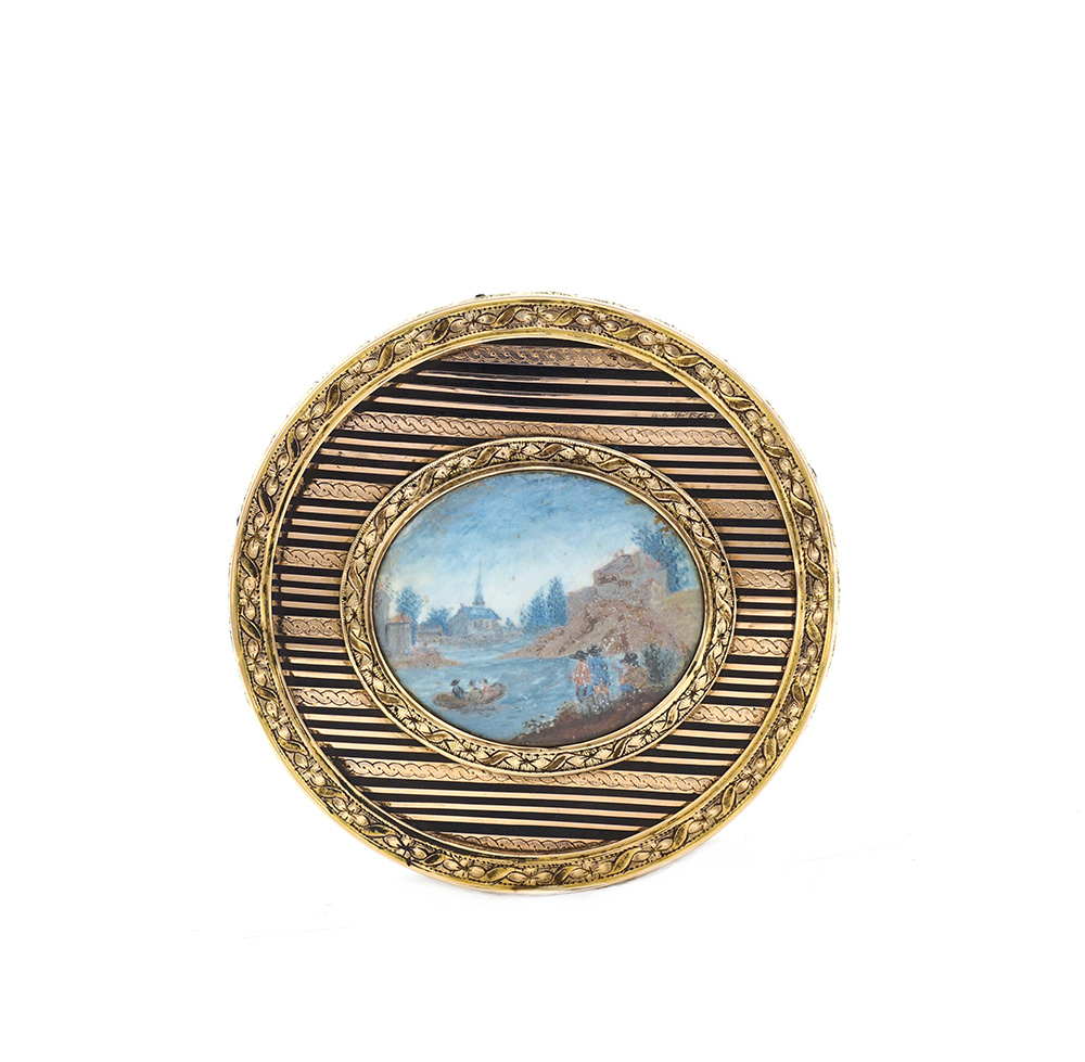 Tabacchiera di forma circolare in oro bicolare e tartaruga Luigi XVI, Francia, 1768 - 1774 3x7,5 cm. coperchio centrato da una una miniatura ovale raffigurante un paesaggio fluviale con personaggi