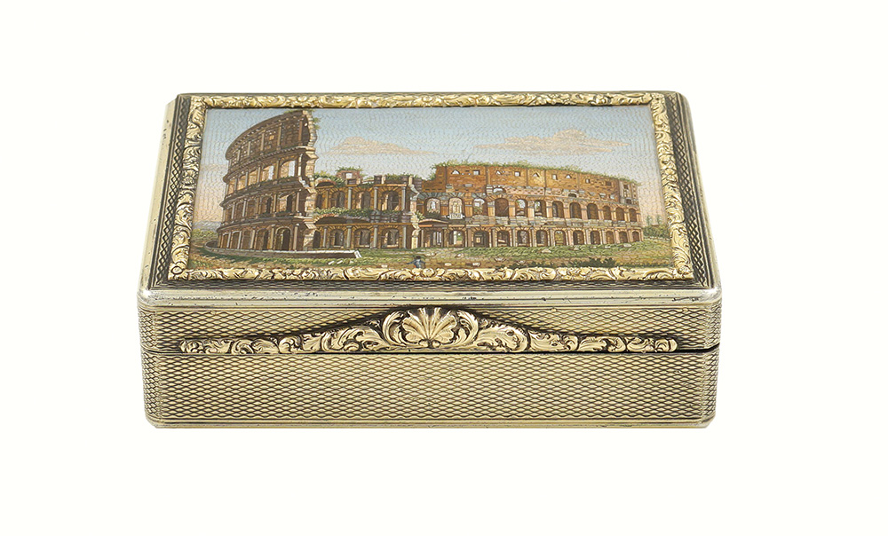 tabacchiera in argento vermeil con placca rettangolare in micromosaico raffigurante "Il Colosseo", come era nei primi anni del 1800, quando i restauri intrapresi sotto il Pontificato di Pio VII (1800-1823) non erano ancora iniziati, reca bolli Londra, 1828, orafo John Linnit, peso lordo 242.6 gr.
