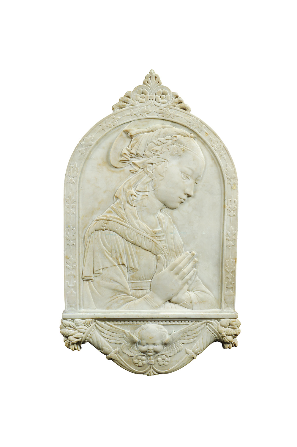 Placca in marmo Italia, XX Sec. 67x41x5 cm. scolpita a raffigurare una "Madonna Orante", lievi difetti