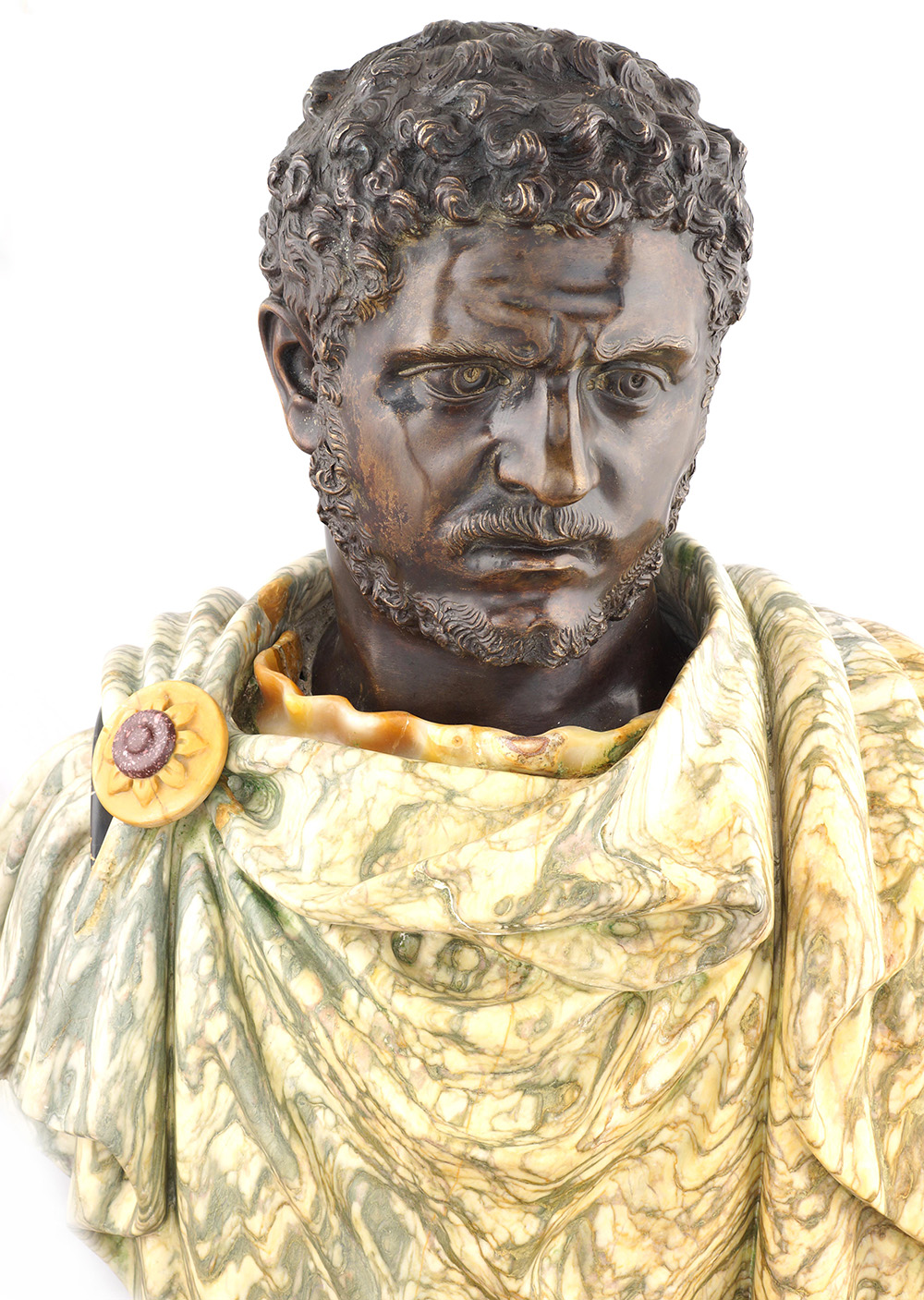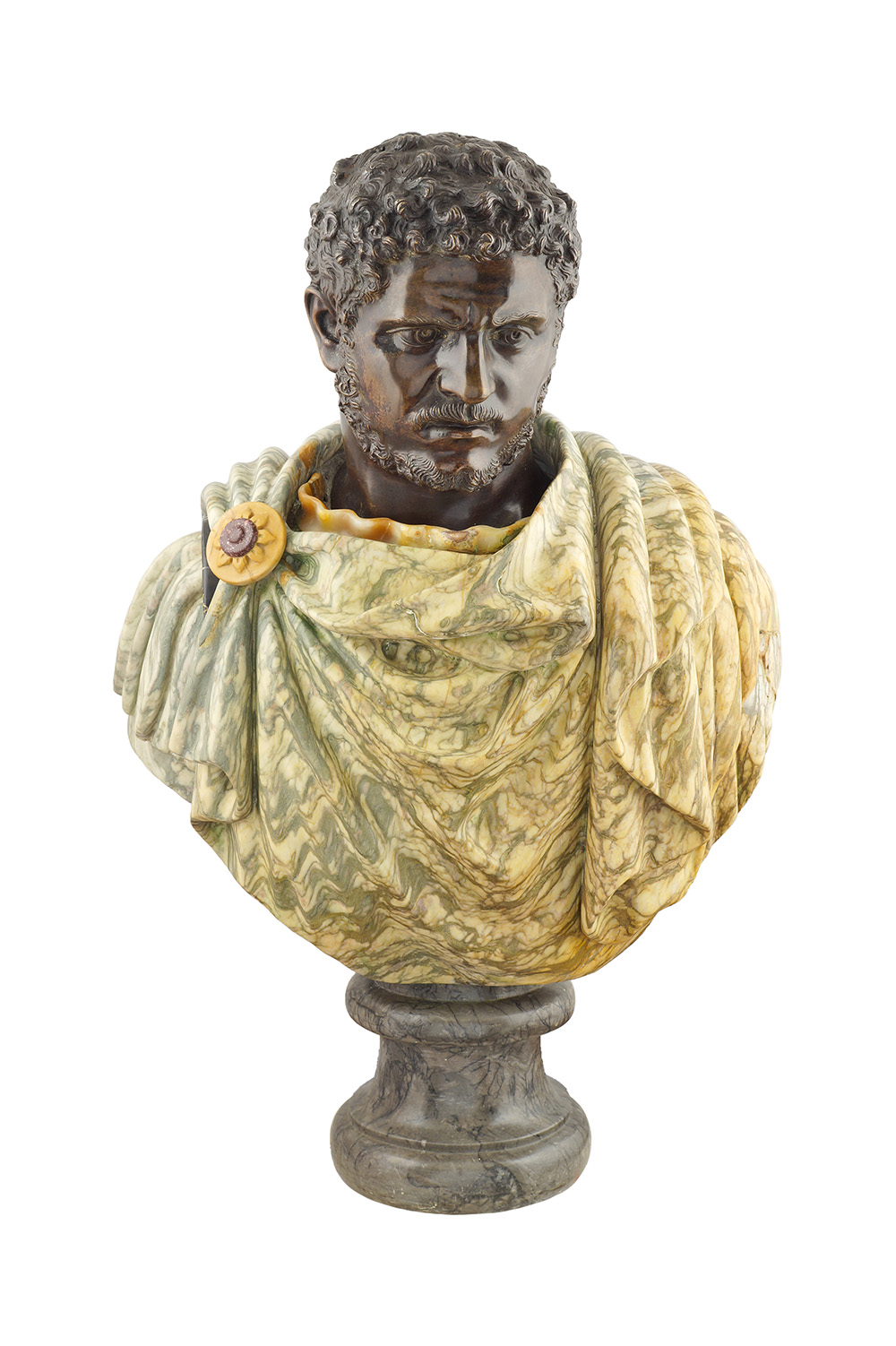 Busto raffigurante Caracalla Roma, fine del XIX Sec. 80x60x30 cm. panneggio in marmo Cipollino, testa in bronzo cesellato e patinato, base a plinto in marmo Bigio