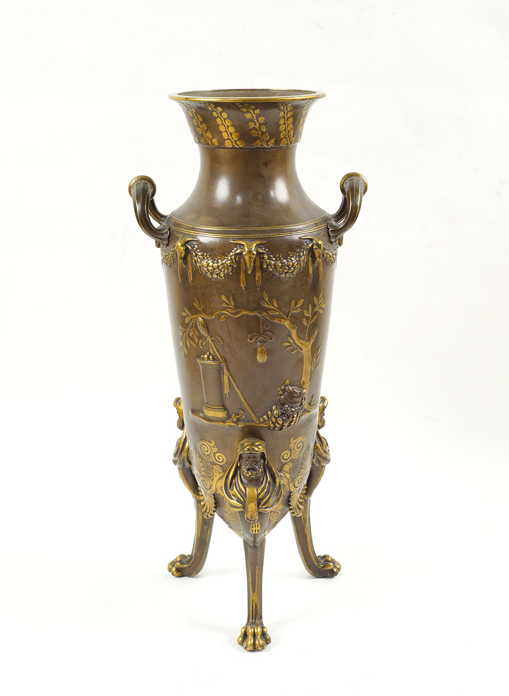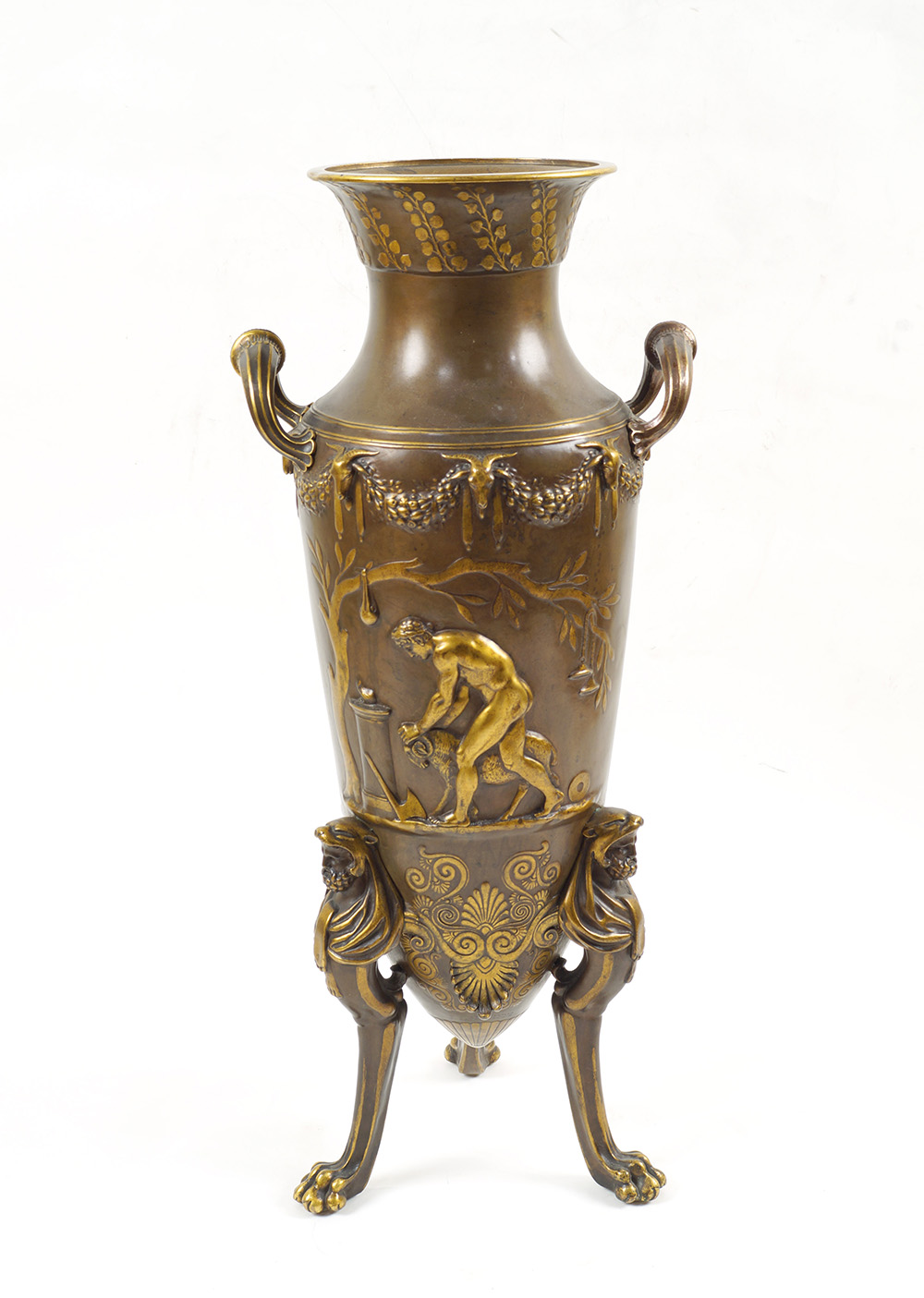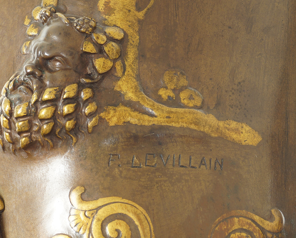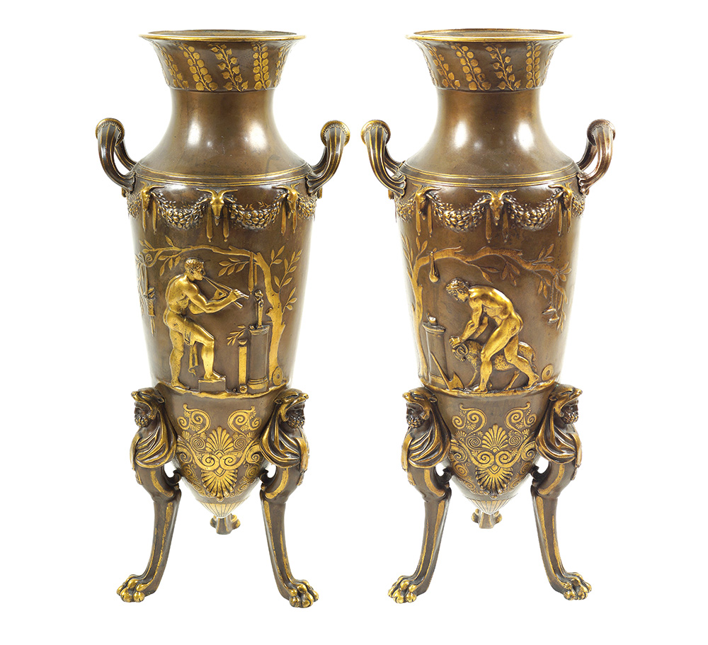 "Il sacrificio", coppia di vasi ad anfora greca con due manici in bronzo dorato e patinato decorati con scene tratte dall'antico e tralci d'uva, strumenti musicali e festoni , poggianti su tripode decorato con teste di Ercole, firmati F. Levillain e F. Barbedienne.