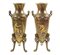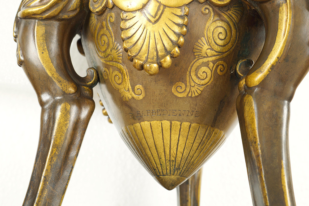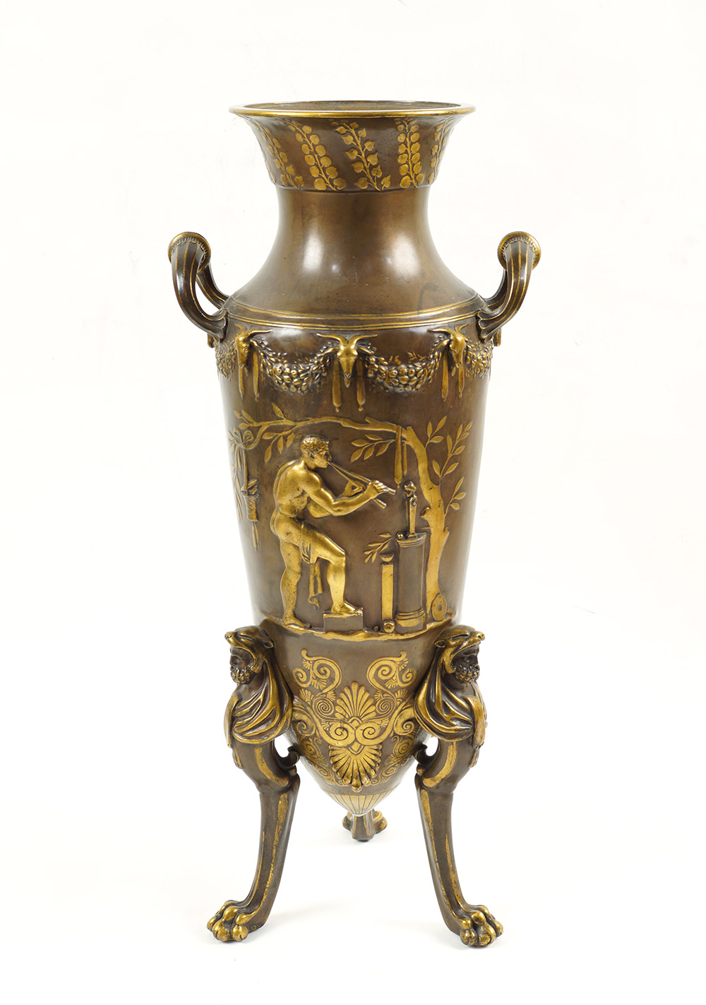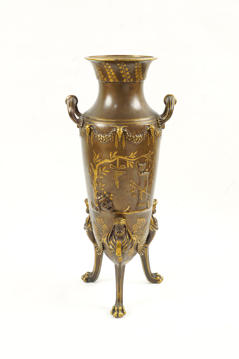 "Il sacrificio", coppia di vasi ad anfora greca con due manici in bronzo dorato e patinato decorati con scene tratte dall'antico e tralci d'uva, strumenti musicali e festoni , poggianti su tripode decorato con teste di Ercole, firmati F. Levillain e F. Barbedienne.