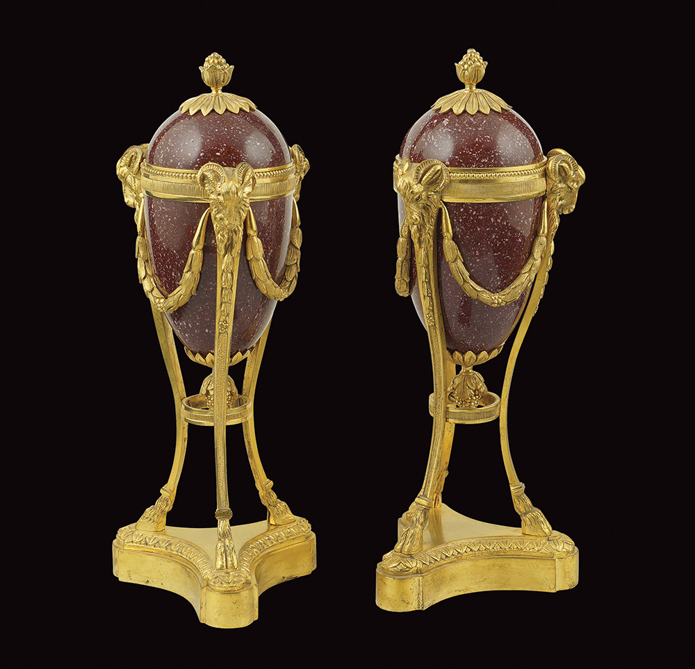 Coppia di cassolettes in porfido rosso Francia, XIX Sec. h. 30 cm. struttura in bronzo dorato finemente cesellato e decorato con teste di arieti e motivi vegetali, base a tripode