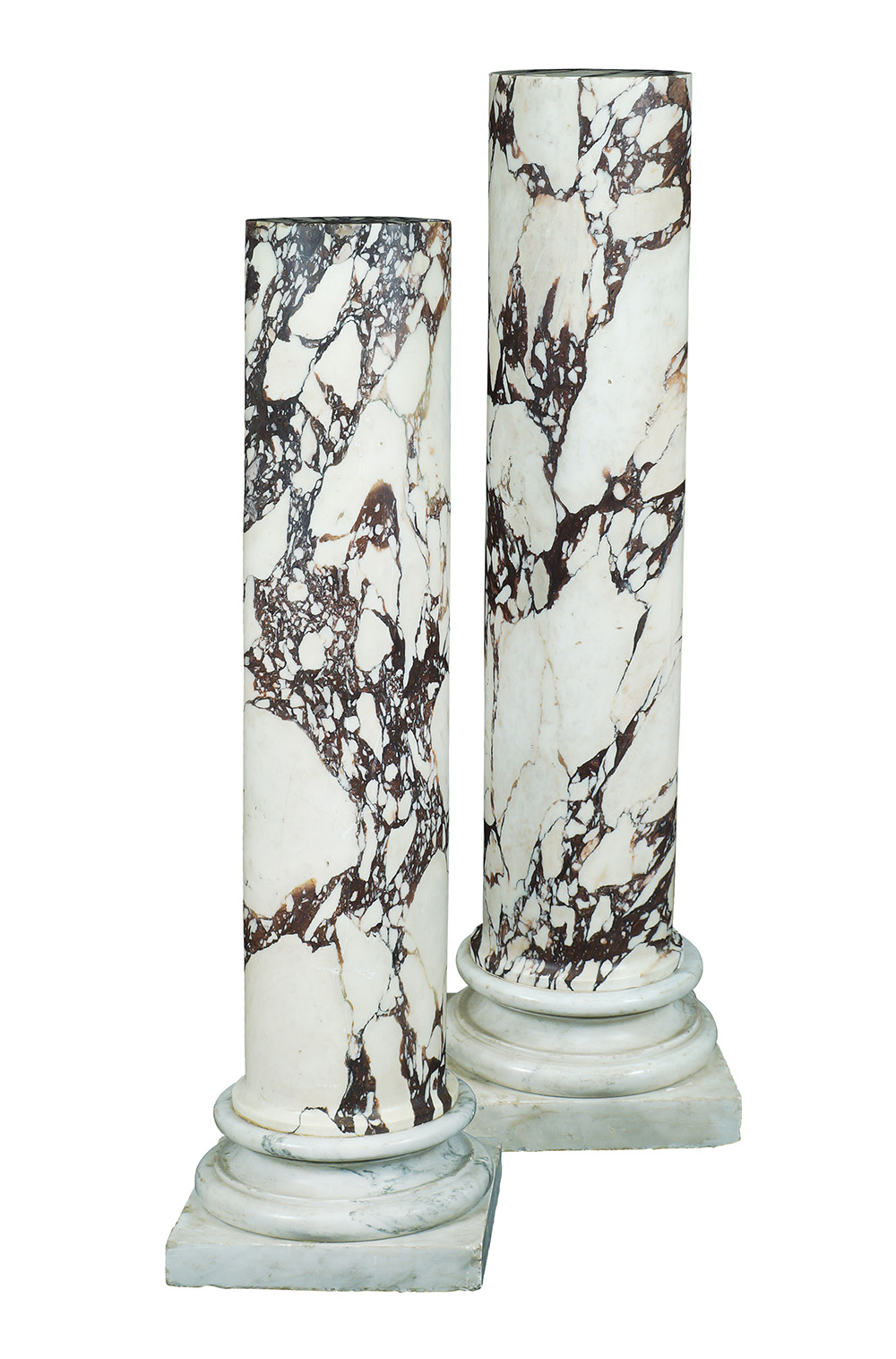 Coppia di colonne tornite in marmo pavonazzetto Italia XIX Sec. 110X30X30 cm. poggianti su base a plinto in marmo bianco di Carrara