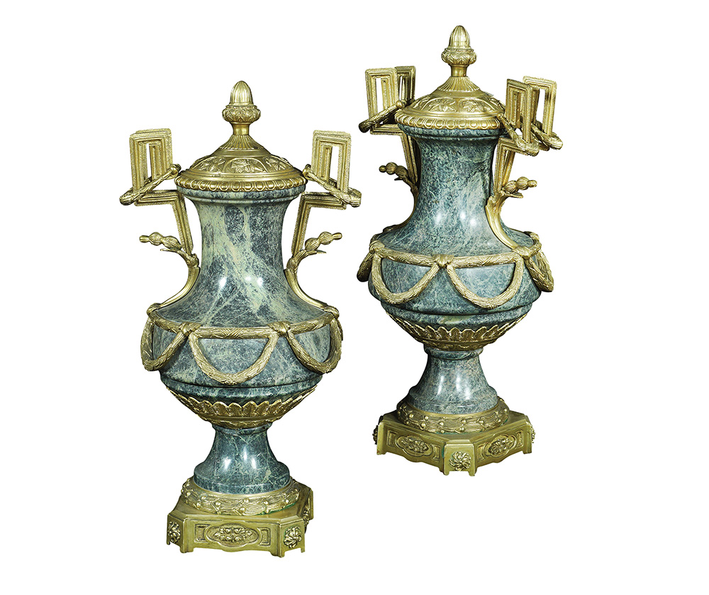 Coppia di vasi in marmo verde Francia XX Sec. 73 cm. montatura in bronzo dorato e cesellato a motivo floreali e festoni