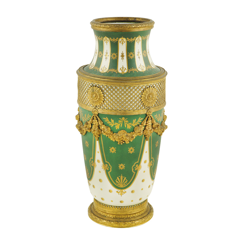 Vaso in porcellana Sevres Francia, XIX-XX Sec. h. 47 cm. dipinto nella tonalità del verde e parzialmente dorato, decorato con applicazioni in bronzo dorato a motivi floreali, base circolare in bronzo, marchio sotto la base