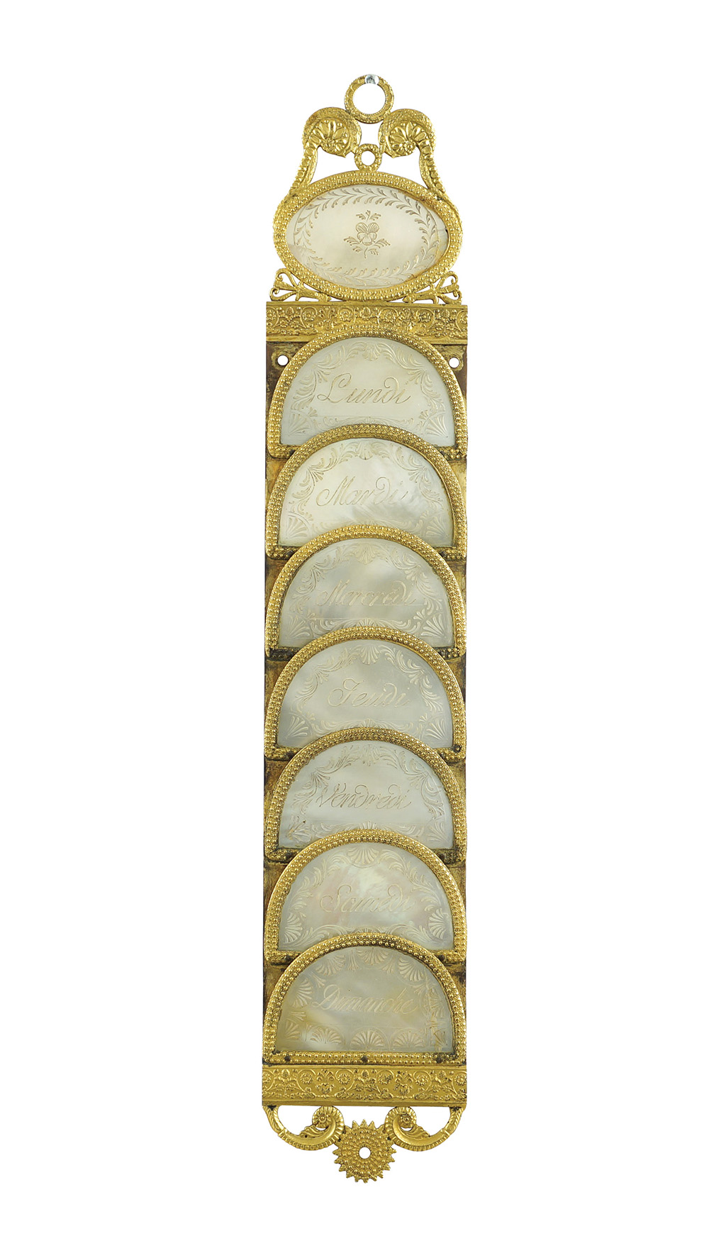 Settimanale da parete in bronzo dorato e cesellato Francia, periodo Carlo X 33x6 cm. composto da otto placche ovali in madreperla