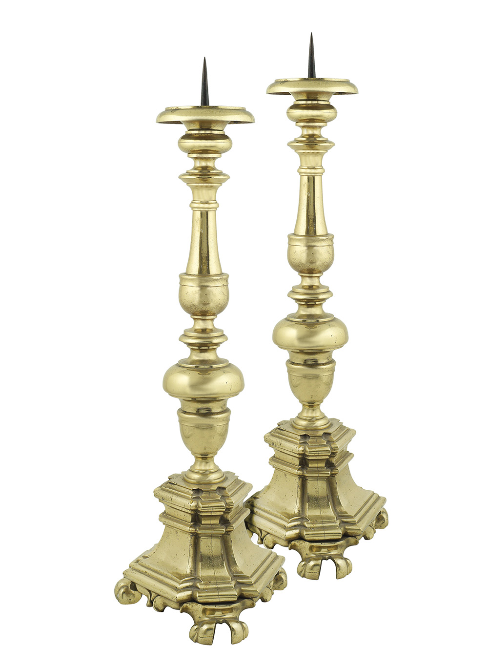 Coppia di torcieri in bronzo dorato Italia, XX Sec. h. 93 cm. e tornito di gusto Luigi XIV, base a tripode con terminali a riccio