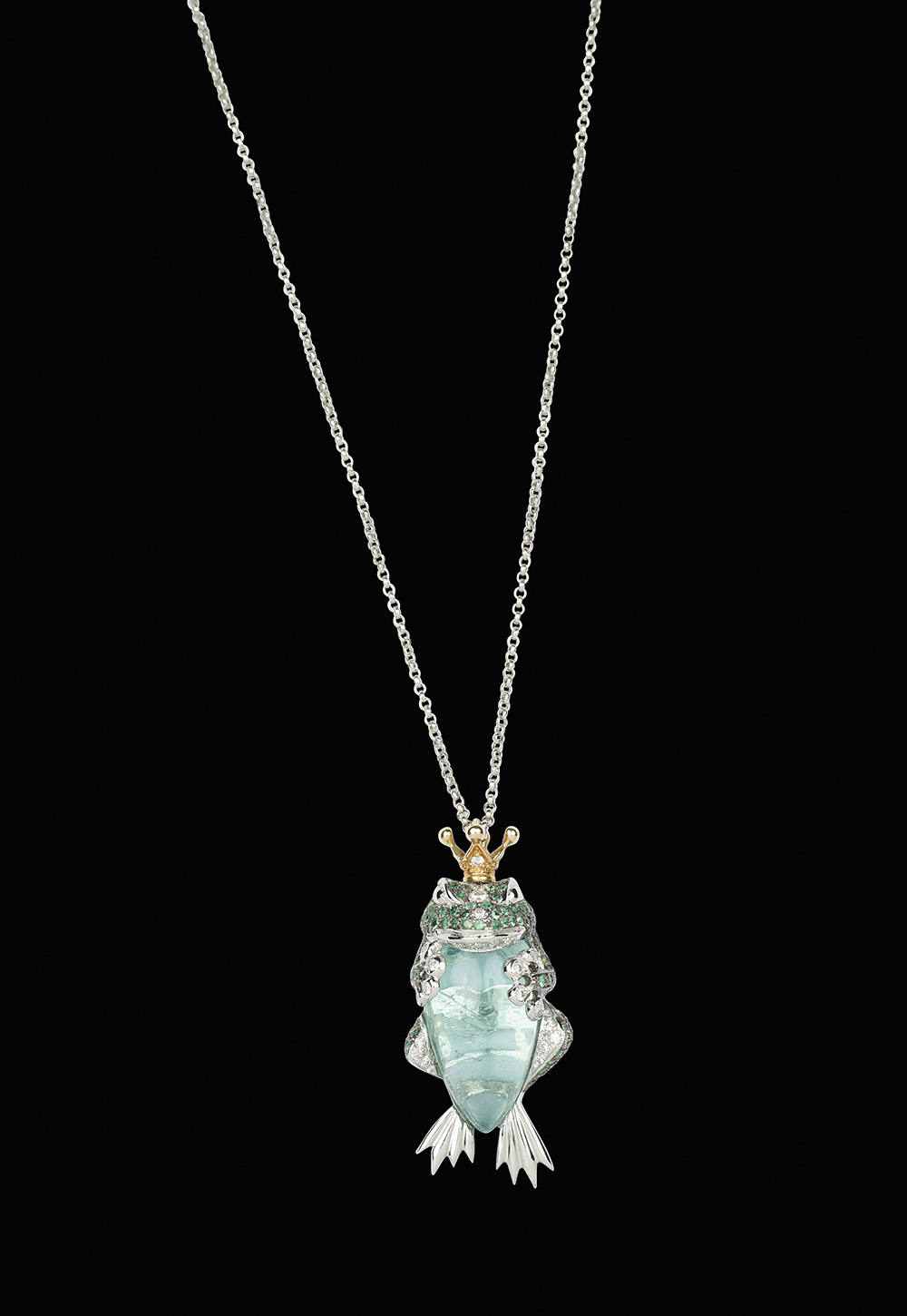 Pendente a foggia di rana in oro bianco 18kt peso 16,9 gr. con acquamarina taglio cabochon diamanti taglio brillante ct 0,30 circa e tzavoriti tonde sormontato da coroncina in oro rosa e brillanti, completo di catenina in oro bianco 18kt