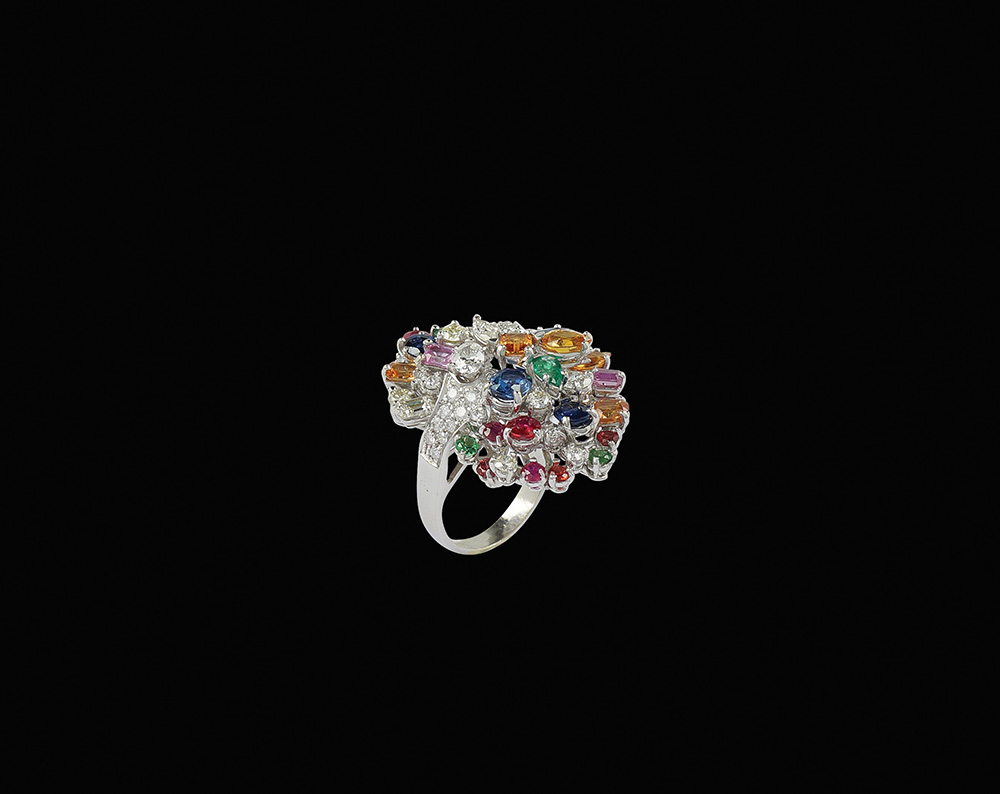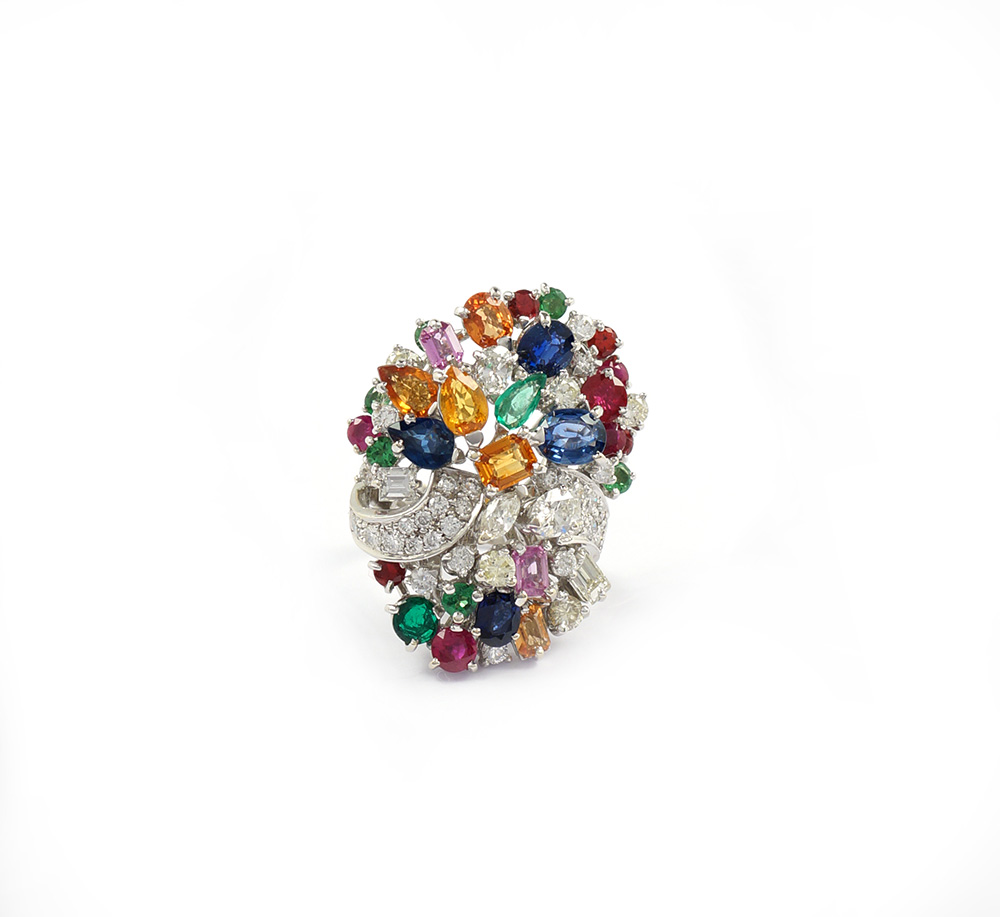 Anello "tutti frutti" in oro bianco 18kt peso 19,0 gr. con diamanti taglio brillante e tagli fantasia ct 2 circa, alternati a rubini, zaffiri, zaffiri gialli, zaffiri rosa e smeraldi di tagli diversi, misura 14