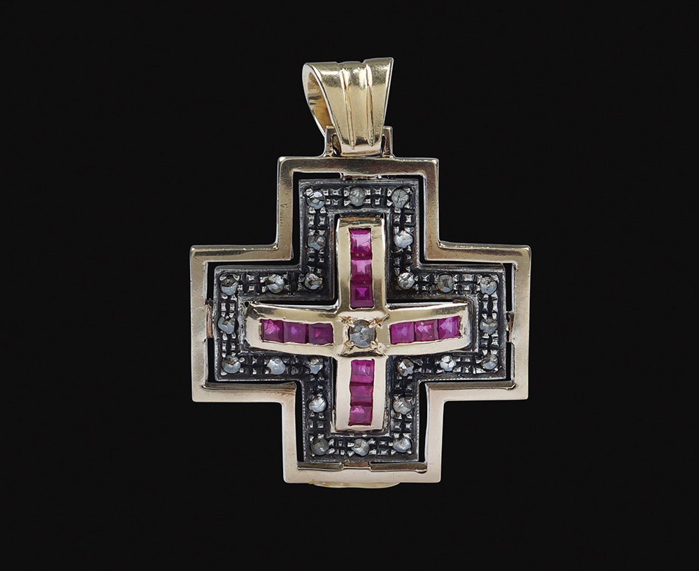 Pendente croce in oro rosa e argento peso 11,8 cm. con rubini taglio carre taglio carrè ct 0,40 circa e rose di diamante