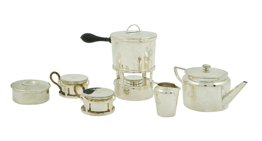 Servizio da viaggio in argento composto da sei oggetti Mosca, 1896 peso lordo 1755 gr. corpo liscio, manici in legno e midollino, orafo argentiere Pavel Akimov Ovchinnikov, maestro di saggio Michael Falayev, punzoni territoriali, dell'argentiere e del saggiatore impressi sotto le basi