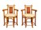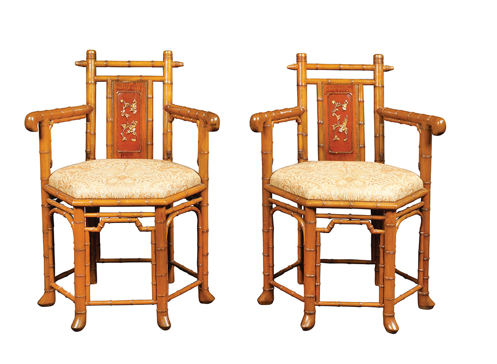 Coppia di poltroncine in bambu' manifattura orientale, XX Sec. 92x65x55 cm. di forma esagonale, schienale in legno dorato ed intagliato a motivi floreali su fondo laccato rosso, sedute imbottite e rivestite in tessuto