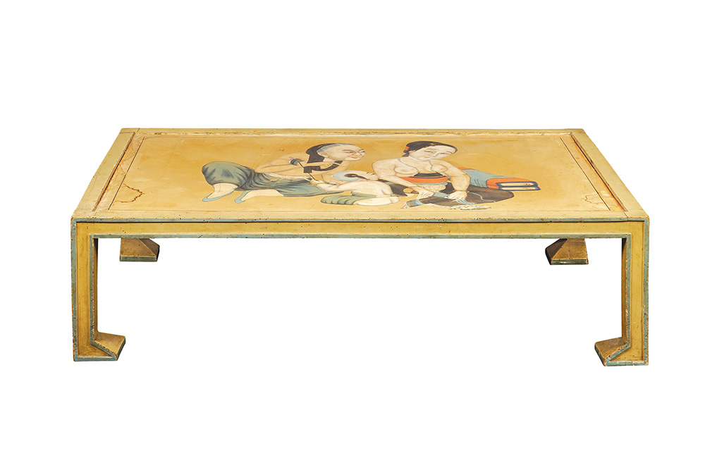 Particolare tavolino da salotto manifattura orientale, XX Sec. 35x121x72 cm. in legno laccato, piano rettangolare con applicato un disegno su carta raffigurante personaggi orientali, lievi difetti