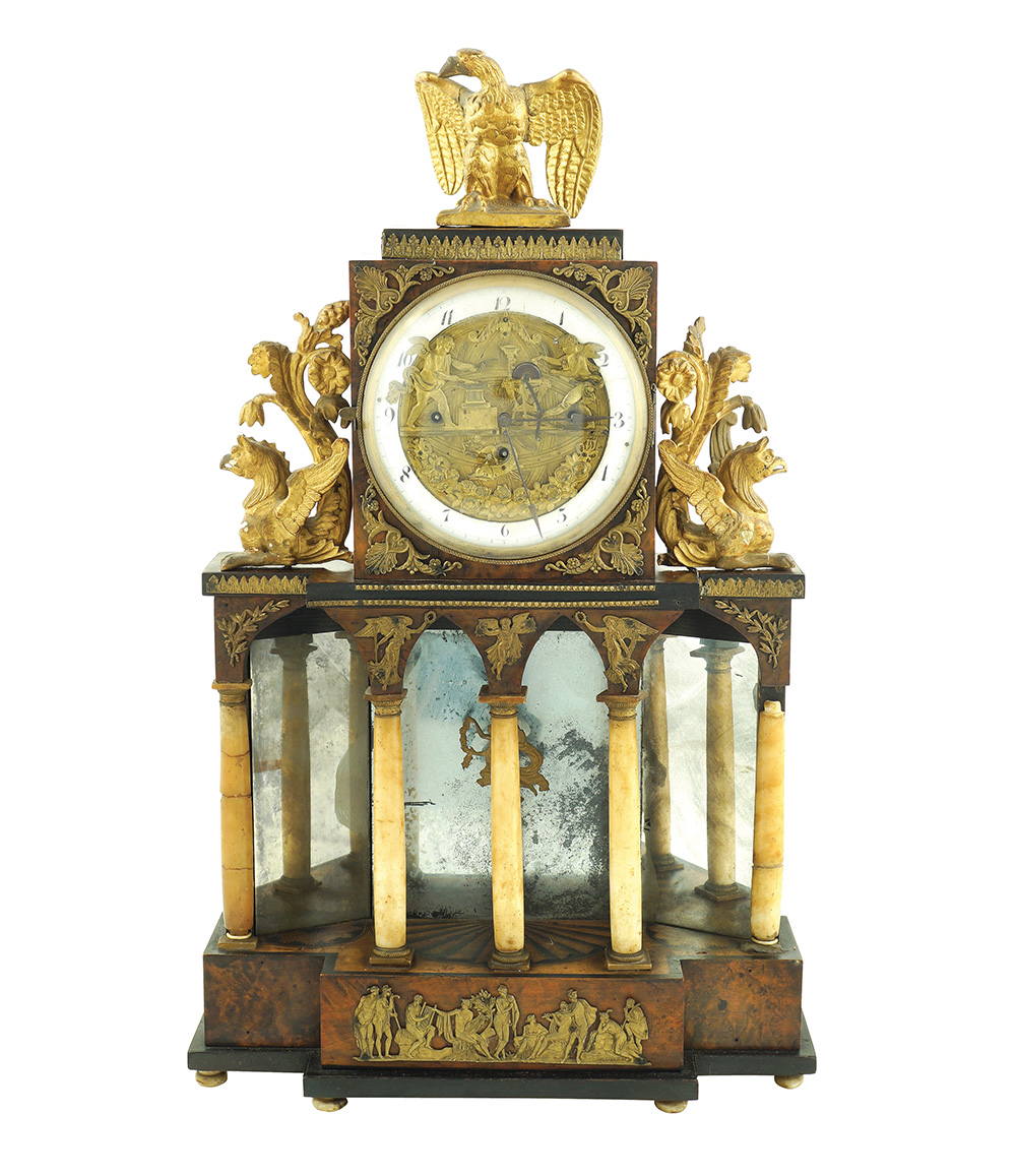 Pendola da tavolo in radica di tuia Vienna, XIX Sec. 69x40x12 cm. riccamente decorata con fregi in bronzo e legno dorato, grifoni ed una grande aquila, parte inferiore a motivi architettonici con colonne in alabastro e specchi a mercurio, quadrante con corona in smalto bianco ed interno in bronzo finemente cesellato a raffigurare due amorini che si animano con il movimento dell'orologio impegnati rispettivamente nella forgiatura e nella affilatura delle frecce.