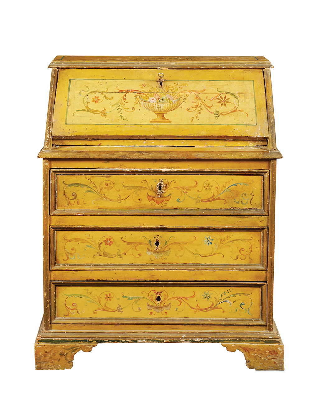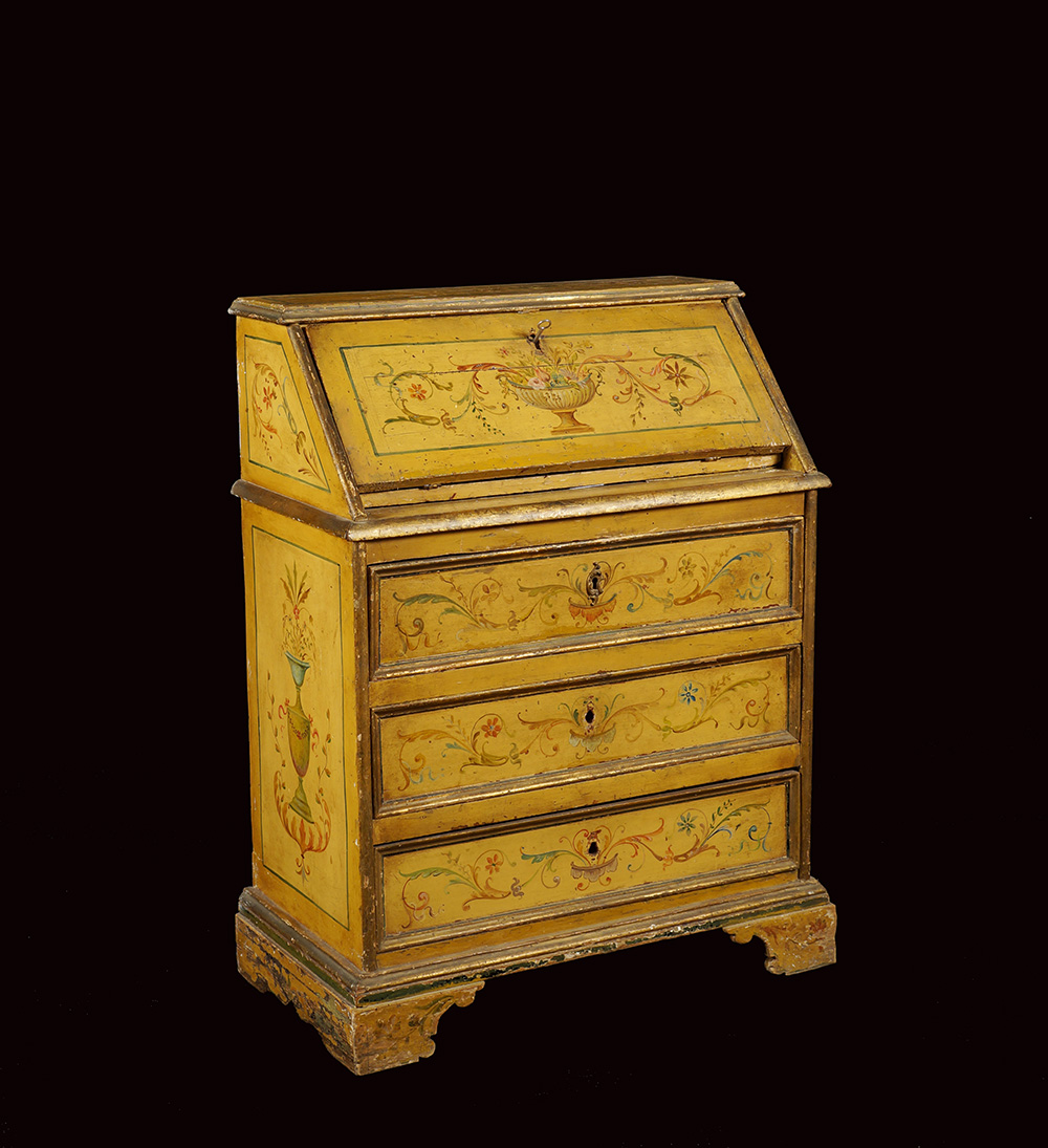 Ribalta in legno laccato Italia, inizio XX Sec. 98x73x39 cm. dipinta in policromia a motivi floreali e vegetali, fronte a calatoia con tiretti all' interno e tre cassetti sottostanti, difetti e mancanze