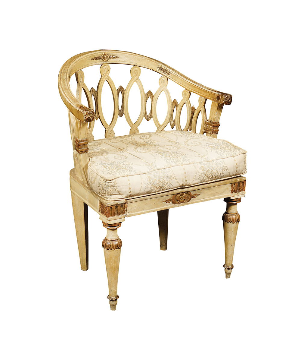 Poltrona a pozzetto in legno laccato e parzialmente dorato Italia, fine XVIII Sec. 77x60x54 cm. schienale di linea arcuata e traforato a motivi torchon, gambe anteriori tornite