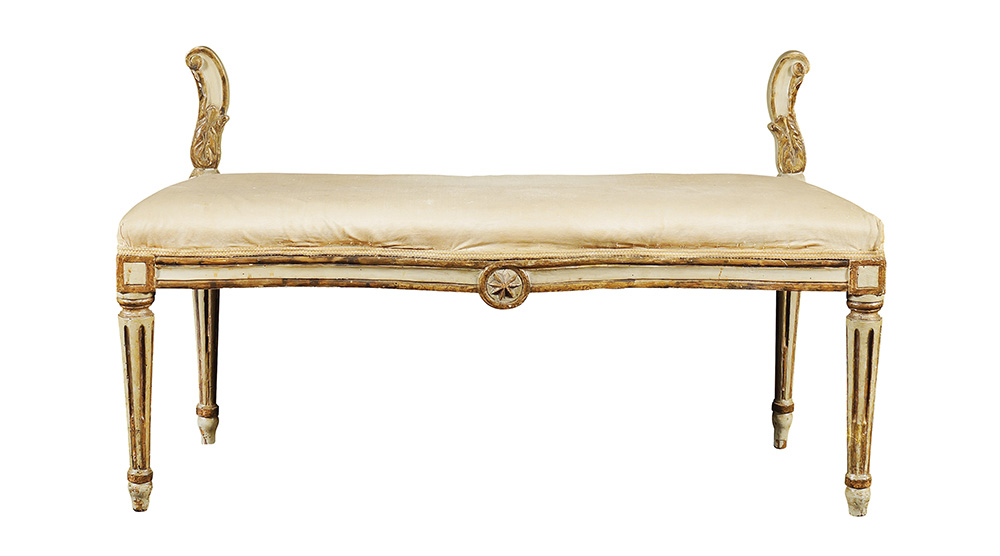 Panchetta in legno laccato e parzialmente dorato Roma, XIX Sec. 66x110x35 cm. intagliata e decorata con motivi di volute, seduta rivestita in tessuto, gambe tornite e scanalate
