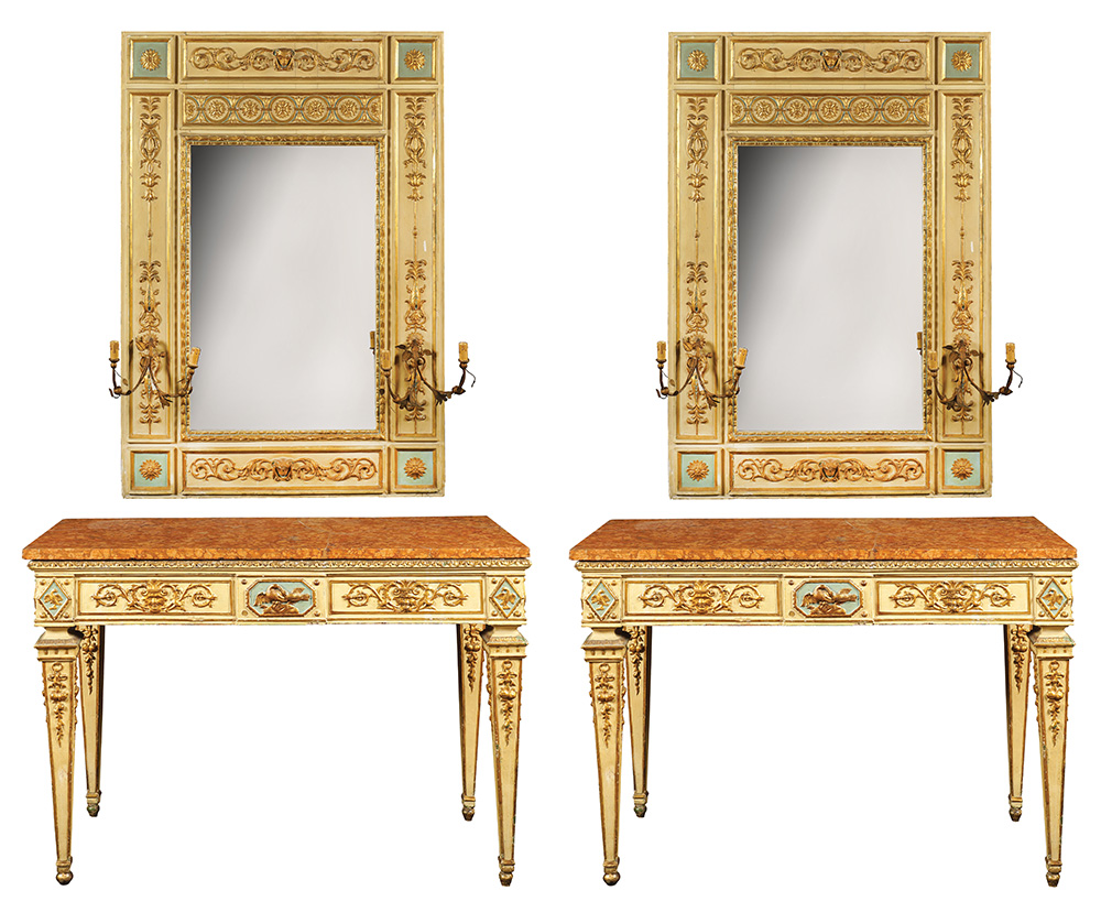 Coppia di consoles con specchiere Italia, primi anni del XIX Sec. 242x120x60 cm. legno laccato e dorato, finemente intagliate a motivi neoclassici a volute vegetali e mascheroni poggianti su gambe troncopiramidali, due appliques in ferro battuto e forgiato a motivi vegetali completano la decorazione di ogni specchiera, piani in marmo rosso di Verona con rotture e restauri