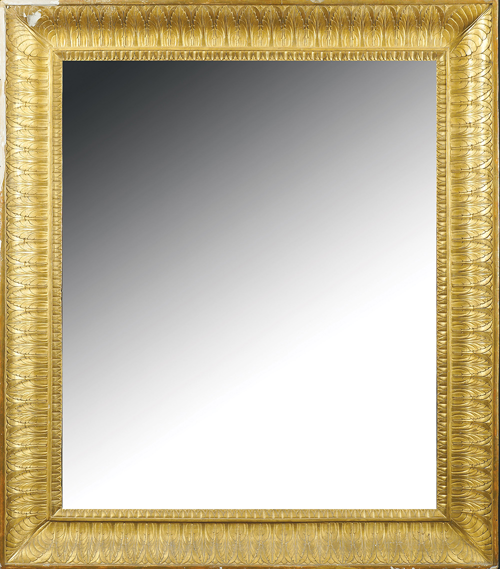 Specchiera in legno dorato Francia, XIX Sec. 95x110 cm. cornice finemente intagliata a motivi di foglie d'acanto, specchio anticato non coevo, difetti