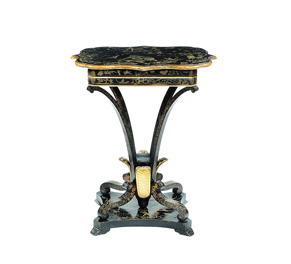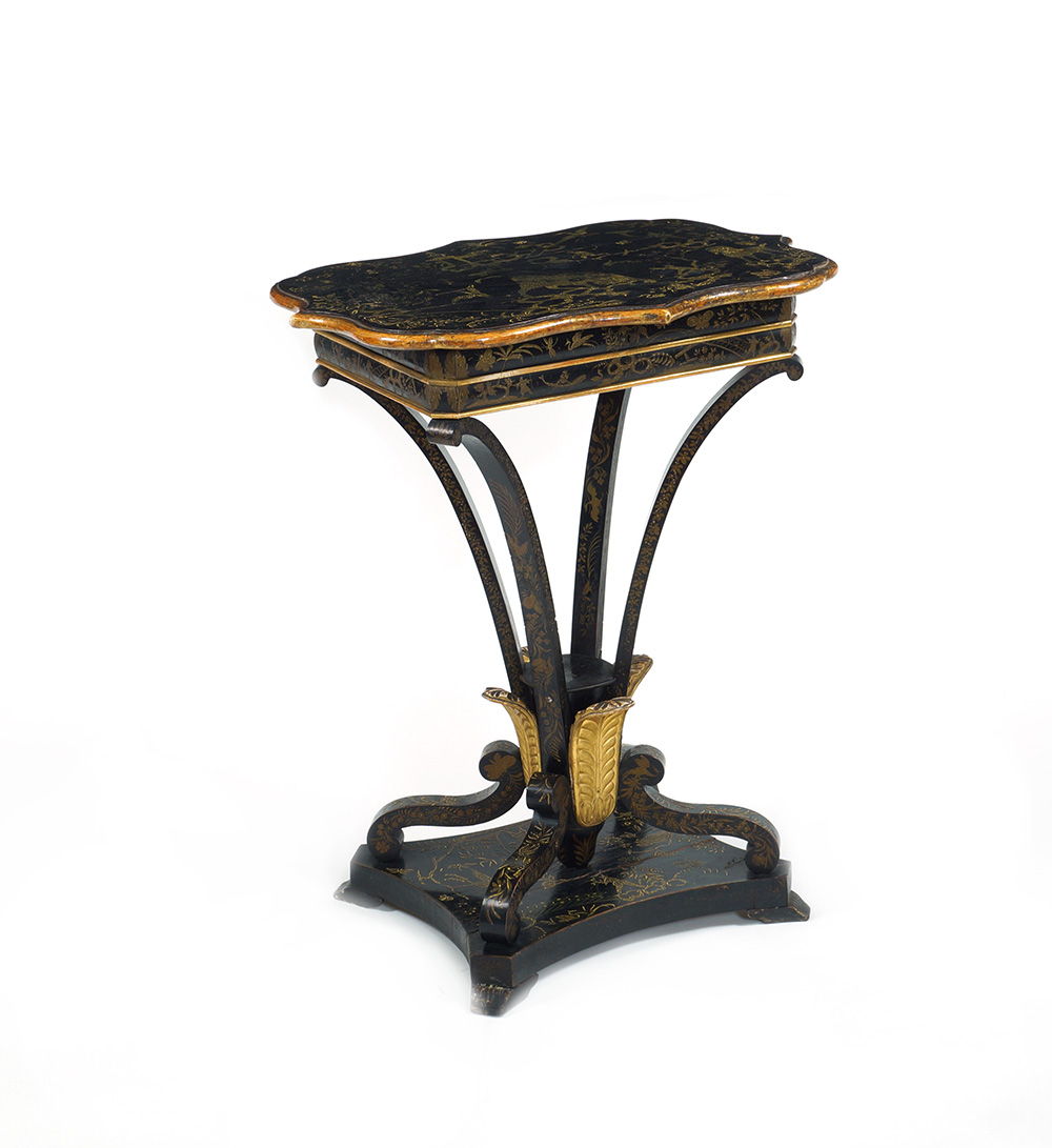 Tavolino da lavoro in legno laccato Inghilterra, XIX Sec. 80x65x50 cm. decorato a chinoiserie con scene di caccia, piano sagomato apribile, con all'interno divisori e scomparti vari poggiante su sostegno di linea arcuata riunito in basso da elementi vegetali in legno finemente intagliato e dorato, lievi difetti