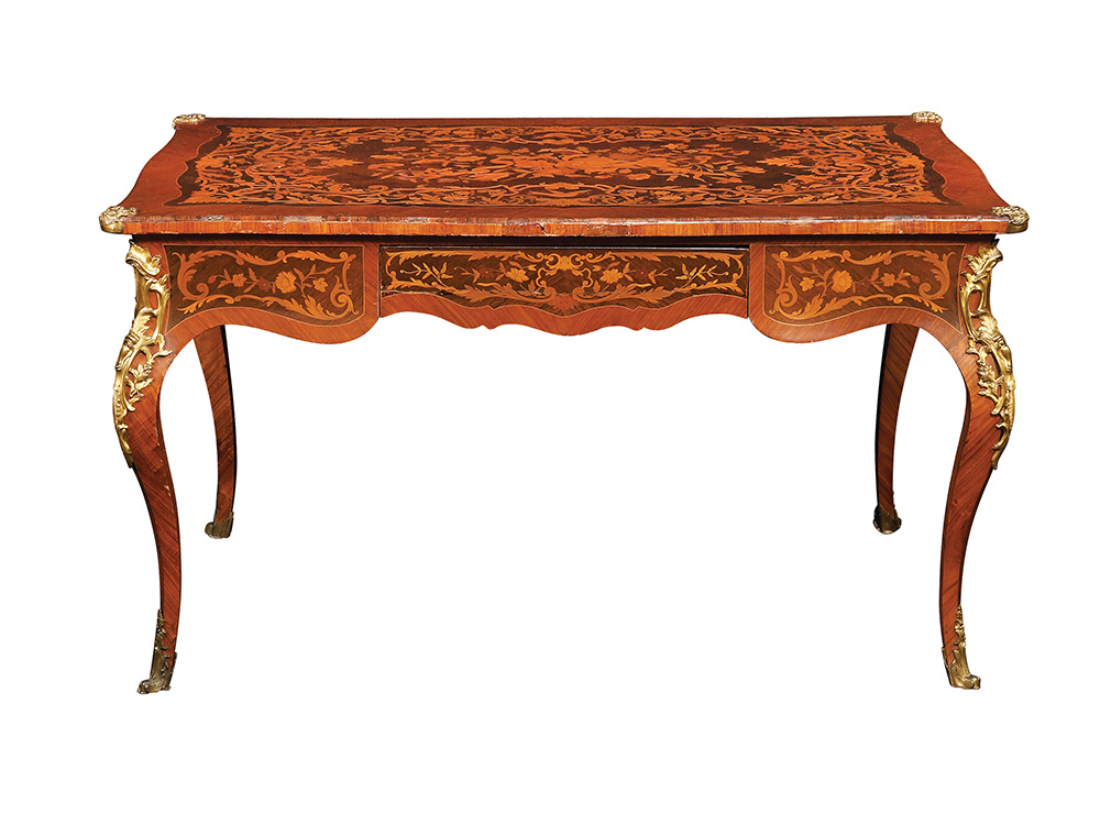 Scrittoio da centro in bois de rose Francia, fine XIX Sec. 77x137x85 cm. riccamente intarsiato a motivi vegetali in legni di frutto, piano rettangolare con un cassetto sottostante, fregi in bronzo dorato e cesellato, lievi difetti