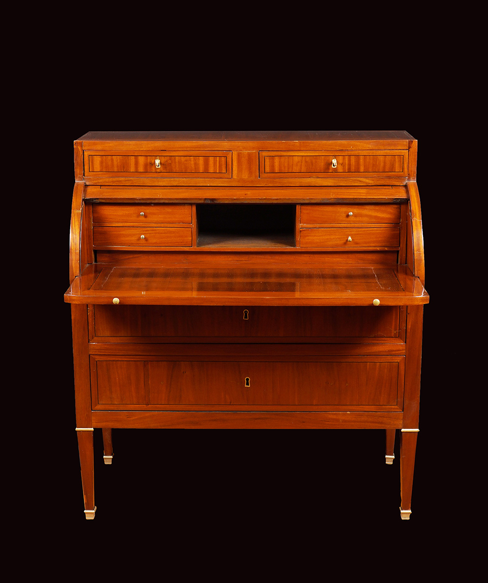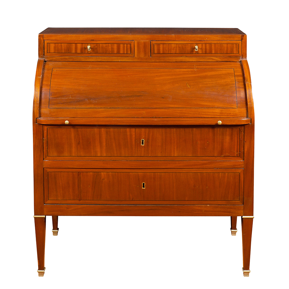 Bureau cylindre in mogano Francia, fine del XIX Sec. 116x103x48 cm. alzata a due cassetti, fronte a calatoia a rullo con all'interno tiretti e scomparti vari, due cassetti sottostanti, gambe troncopiaramidali