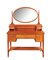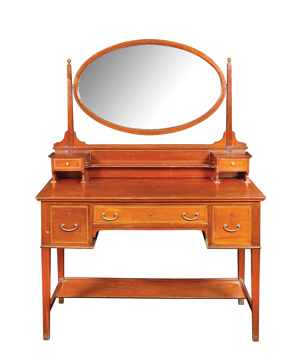 Mobile toletta in mogano Sicilia, inizio XX Sec. 160x122x60 cm. filettata in legni vari, alzata superiore con specchio ovale basculante sorretto da colonnine troncopiramidali e due cassetti laterali, piano rettangolare con tre cassetti sottostanti, manifattura Drucot - Palermo.