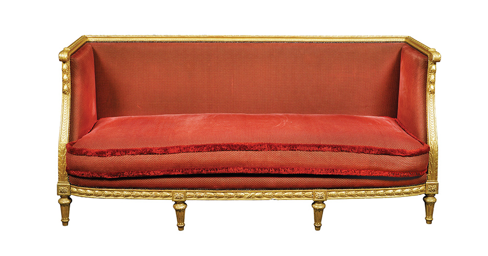 Divano a tre posti in legno dorato Francia, XIX Sec. 95x200x75 cm. intagliato a motivi vegetali, seduta e schienale imbottiti e rivestiti in velluti rosso