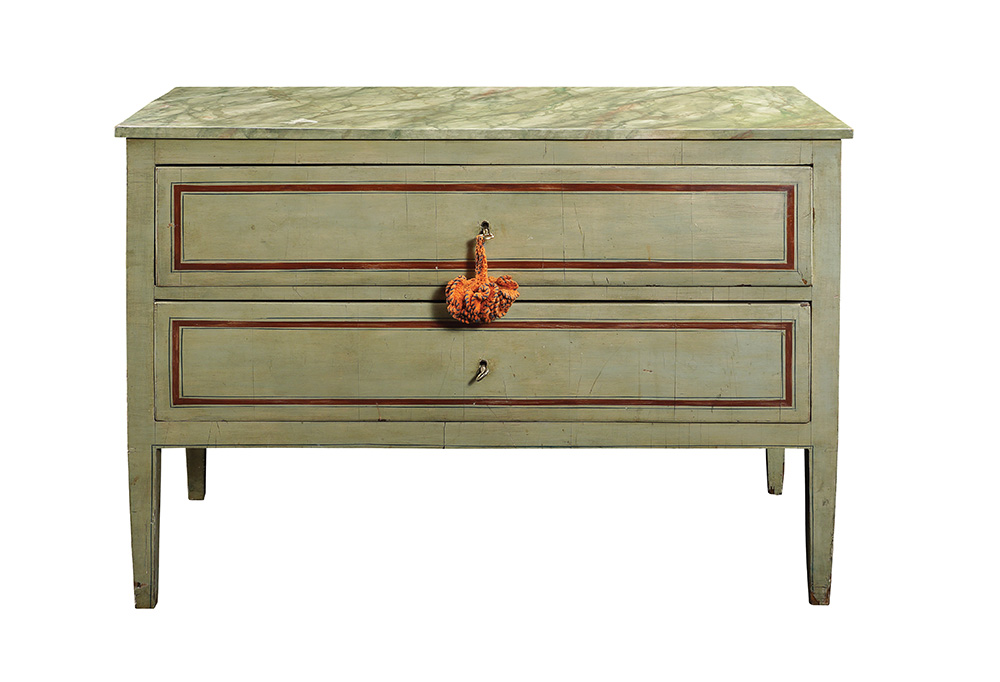 Cassettone Luigi XVI in legno laccato verde fine XIX Sec. 87x125x56 cm. piano rettangolare dipinto a simulare il marmo, fronte a due cassetti, gambe troncopiramidali