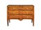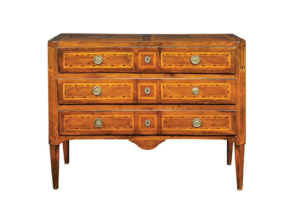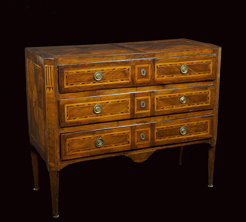 In questa commode probabilmente di manifattura tosco-emiliana si assiste a un deciso orientamento degli artigiani verso il gusto inglese. In questo caso si tratta di un primo approccio dell'ebanista che ha voluto comunque mantenere una base tradizionalista inserendo pero' alcune tarsie riprese da disegni di Robert Adam ed arredi di Thomas Chippendale
