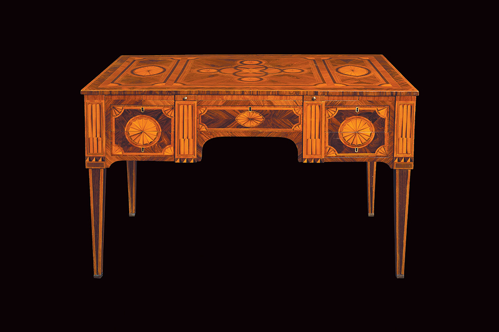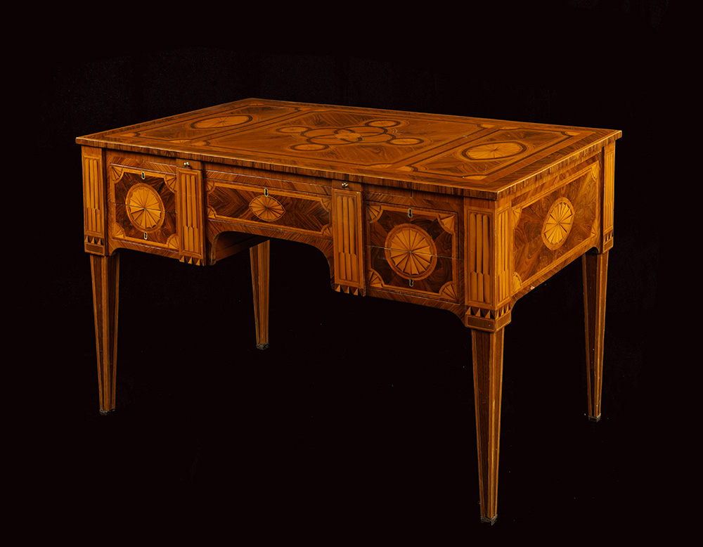 Opera di un abilissimo ebanista questa scrivania mostra una struttura semplice ma elegante con una grande cura dei particolari come dimostrato dai numerosi cassetti segreti celati con grande abilità e la qualità nella scelta dei materiali.