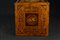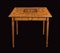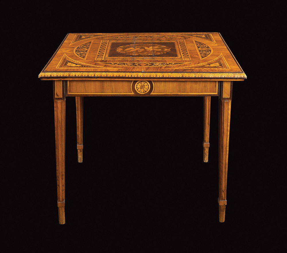 Importante tavolo da gioco in ebano viola, palissandro e bois de rose intarsiato a motivi naturalistici, volute e mascheroni, piano reversibile di forma quadrata centrato da una riserva con all'interno due colombe entro ghirlanda di fiori, agli angoli delfini dalle code intrecciate affiancanti da una conchiglia, sorretto da quattro gambe troncopiramidali con collarino, filettate in legno chiaro; l’interno del tavolo è rivestito in panno verde.
