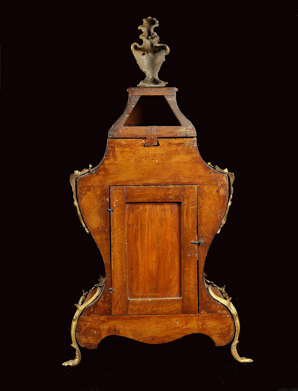 Pendola da tavolo Luigi XV Roma inizio del XIX Sec. 61x30x15 cm. cassa in legno lastronato in ebano viola e bois de rose con ricche applicazioni in bronzo dorato e finemente cesellato a motivi vegetali e di volute, meccanismo firmato Michele Hechkel Roma con quadrante in smalto e numeri romani, da revisionare
