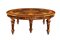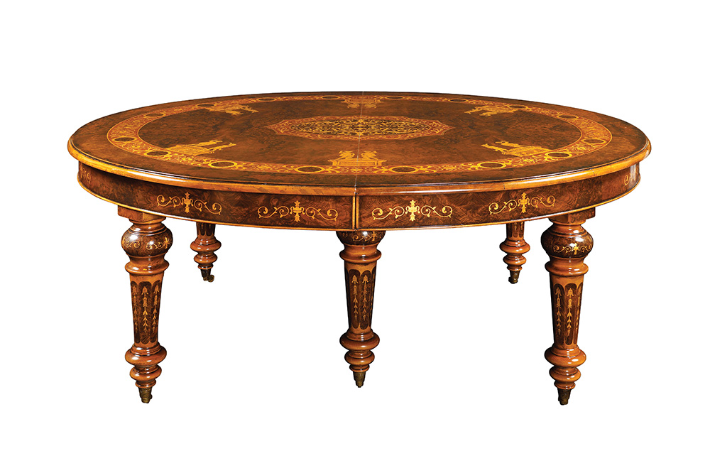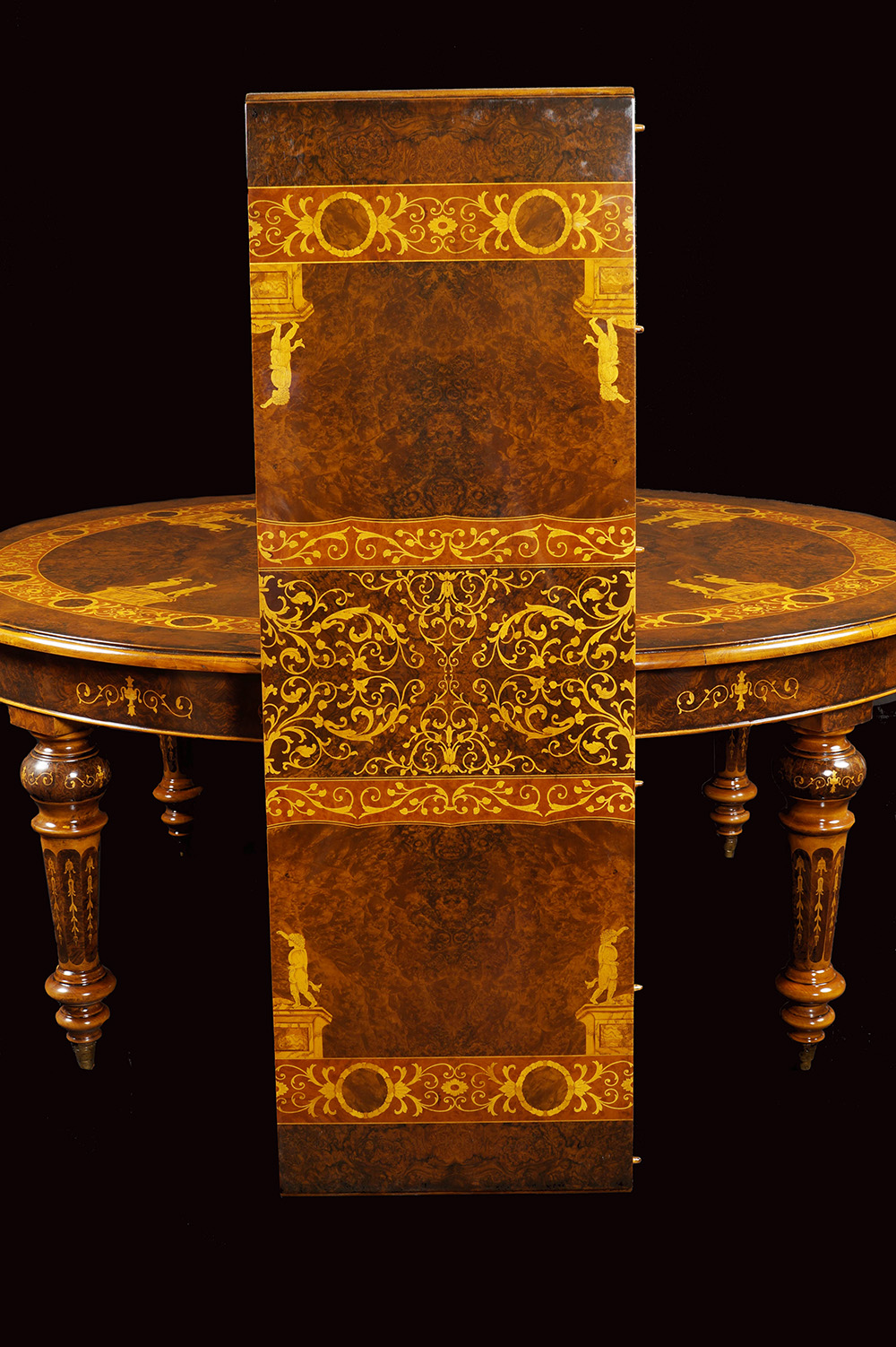 Tavolo da pranzo in radica di noce Inghilterra, XX Sec. 78x183x150 cm. riccamente intarsiato in legno di bosso a motivi vegetali, volute e personaggi neoclassici, piano ovale apribile con meccanismo a manovella poggiante su sei gambe tornite completo di quattro prolunghe originali da 50 cm. cad.