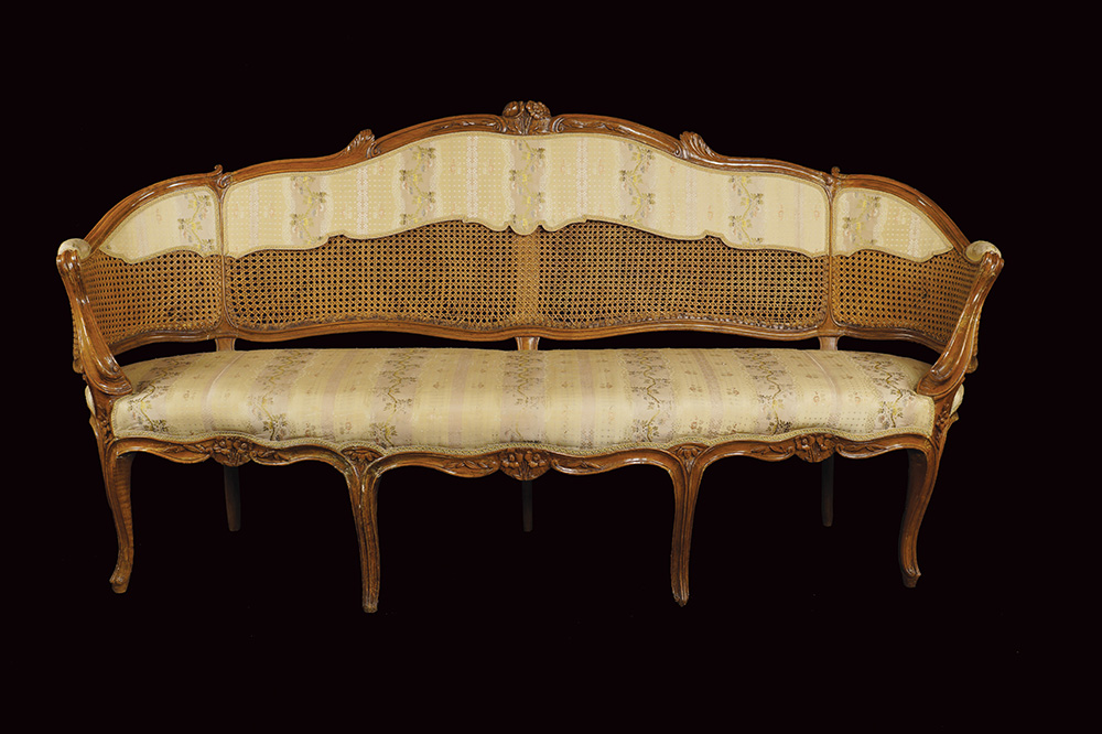 Divano di linea mossa in noce Francia, primi anni del XIX Sec. 104x206x70 cm. finemente intagliato a motivi floreali e volute, seduta imbottita e rivestita in tessuto, schienale in paglia di Vienna