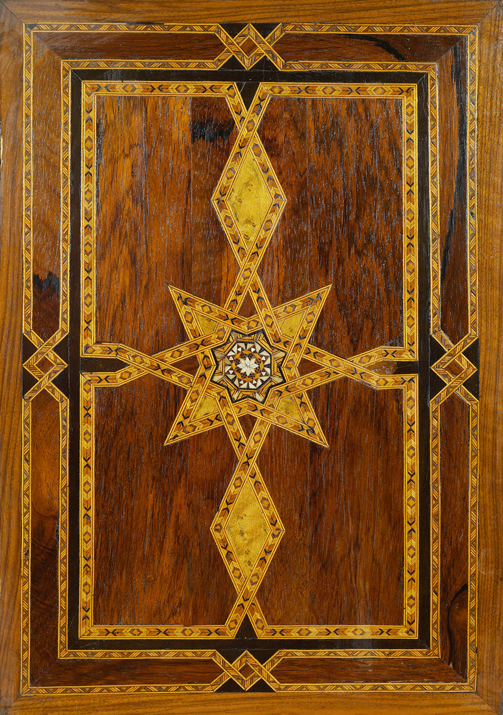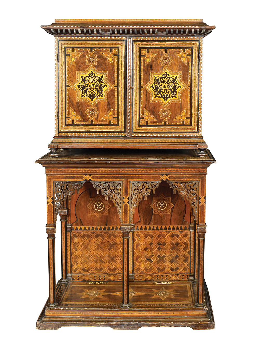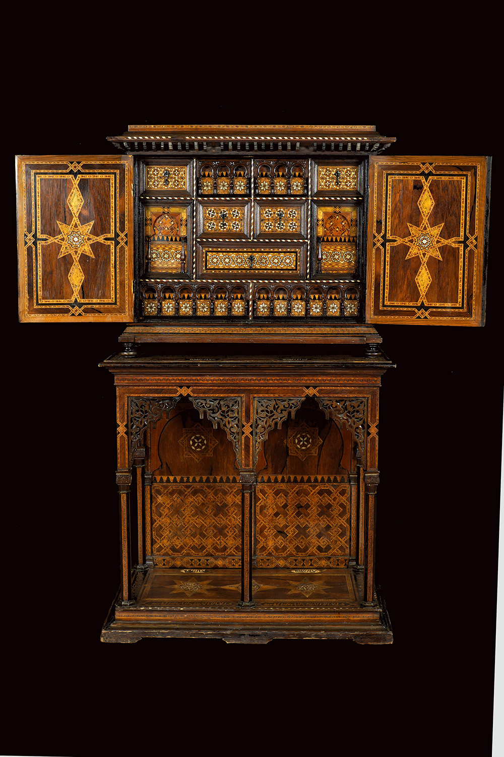 Particolare stipo a due corpi in palissandro Marocco, fine XIX secolo 156x89x43 cm. riccamente intarsiato a motivi geometrici in legni di frutto, madreperla e osso, parte superiore a due sportelli con all'interno cassetti di varie dimensioni e forme, parte inferiore due elementi rettangolari uniti da colonne ottagonali ed elementi in legno traforato e intagliato a motivo floreale