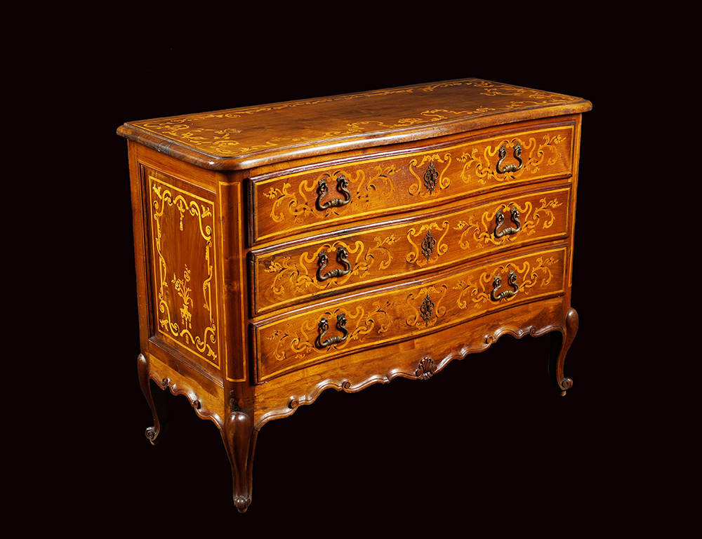 Cassettone a tre cassetti in noce Italia, fine XIX Sec. 92x125x52 cm. riccamente intarsiato in legno di bosso a motivi vegetali e volute, piedi a riccio, lievi difetti
