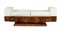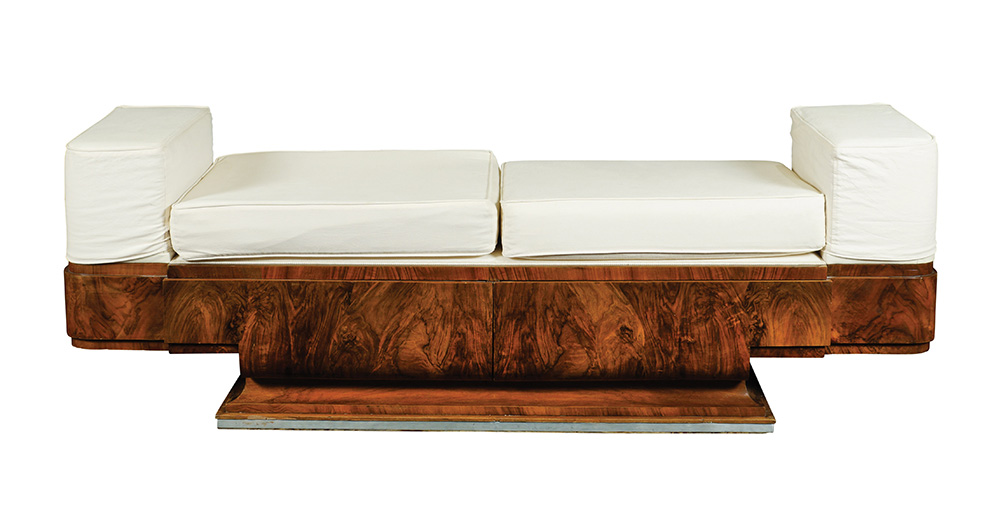 Particolare panca in noce Francia, periodo Decò 68x200x56 cm. struttura con fronte a due cassetti poggiante su base di linea squadrata, seduta e braccioli imbottiti e rivestiti in tessuto bianco, lievi difetti
