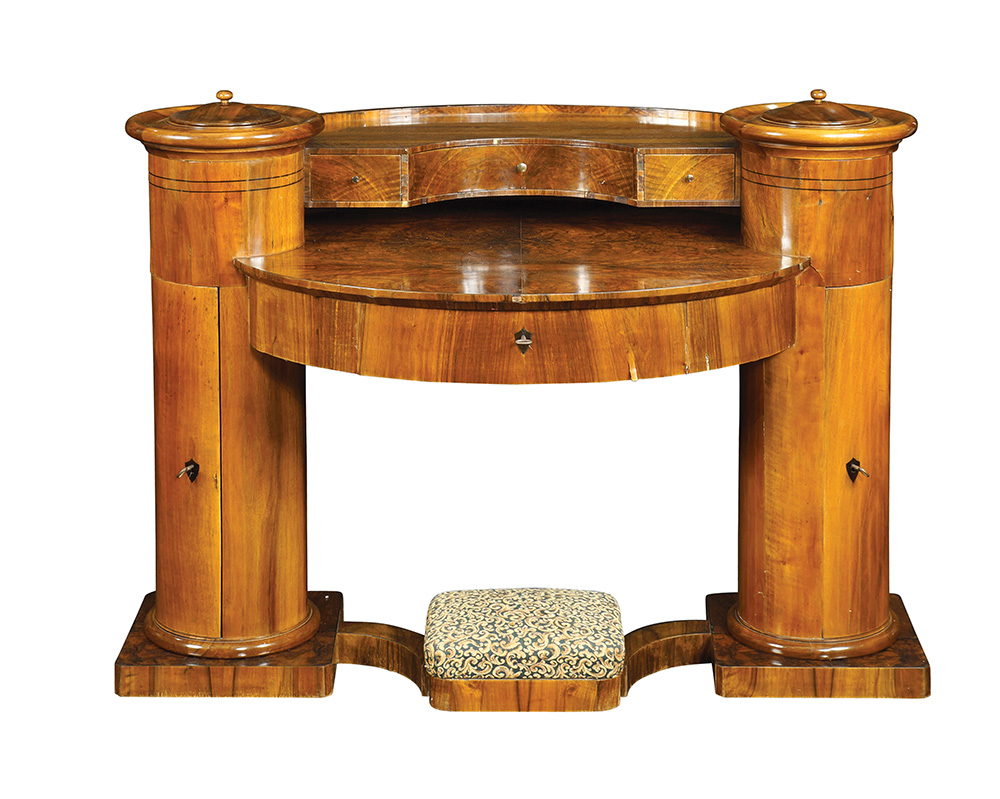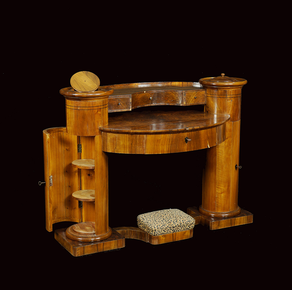 Joseph Danhauser, attribuito a Vienna, prima metà XIX Sec. 102x130x78 cm. rara scrivania costituita da due elementi cilindrici con sportelli e scomparti, piano scrittoio con un cassetto sottostante ed un'alzata con tre tiretti, base di linea sagomata centrata da un poggiapiedi imbottito e rivestito in tessuto, difetti alla lastronatura